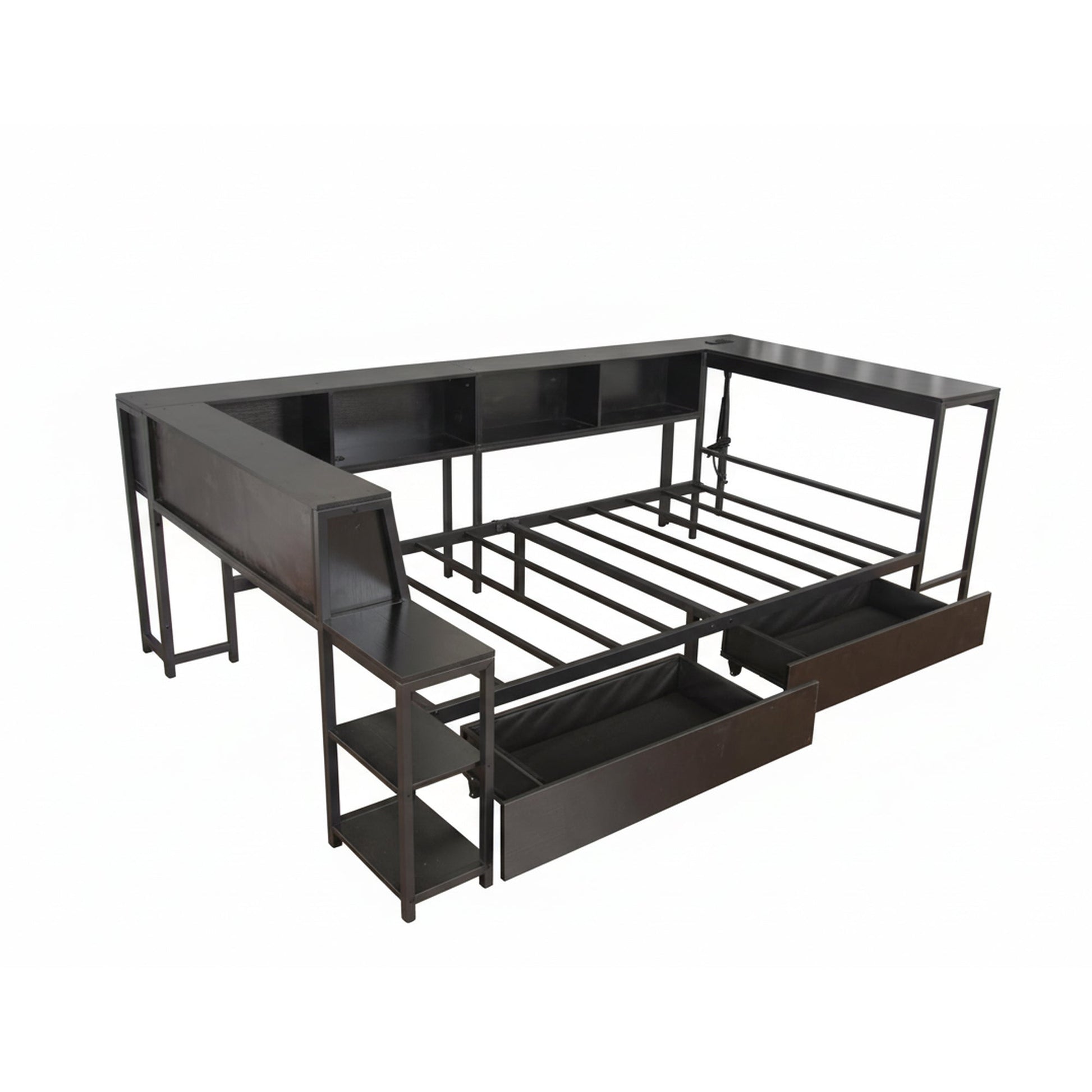 Corner Bed Frame Full Size with Bookcase and 2 Underbed Storage Drawers, Modern Twin Bed with LED Light and Charging Station, Black