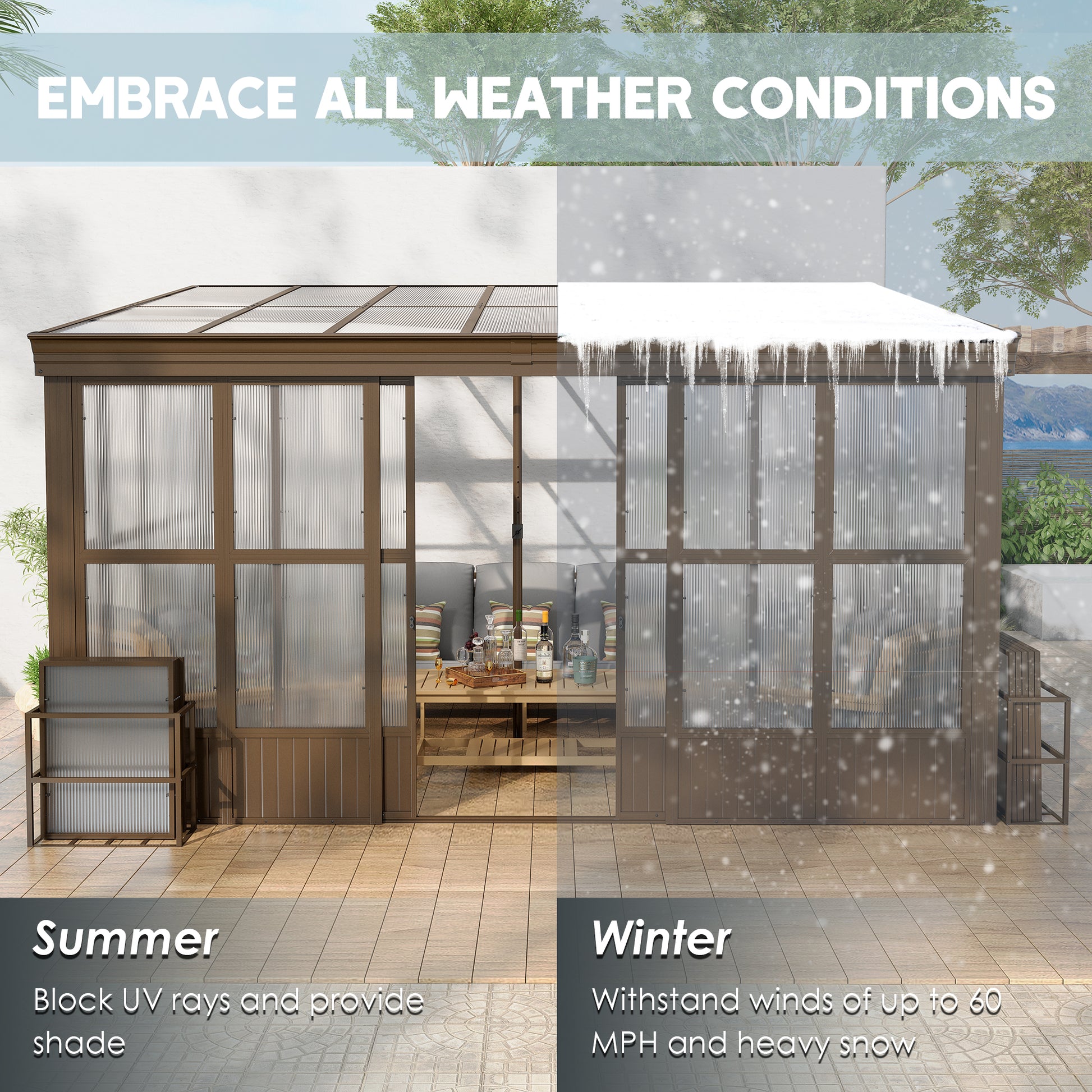 - 💪🏡Sturdy Aluminum Frame- Our solarium is made of premium powder-coated aluminum that can withstand various weather conditions and prevent rust and corrosion, ensuring both aesthetic appeal and long-term outdoor use. Withstand snow pressure of up to 35 pounds per square foot and has a wind resistance rating of 60 miles per hour.