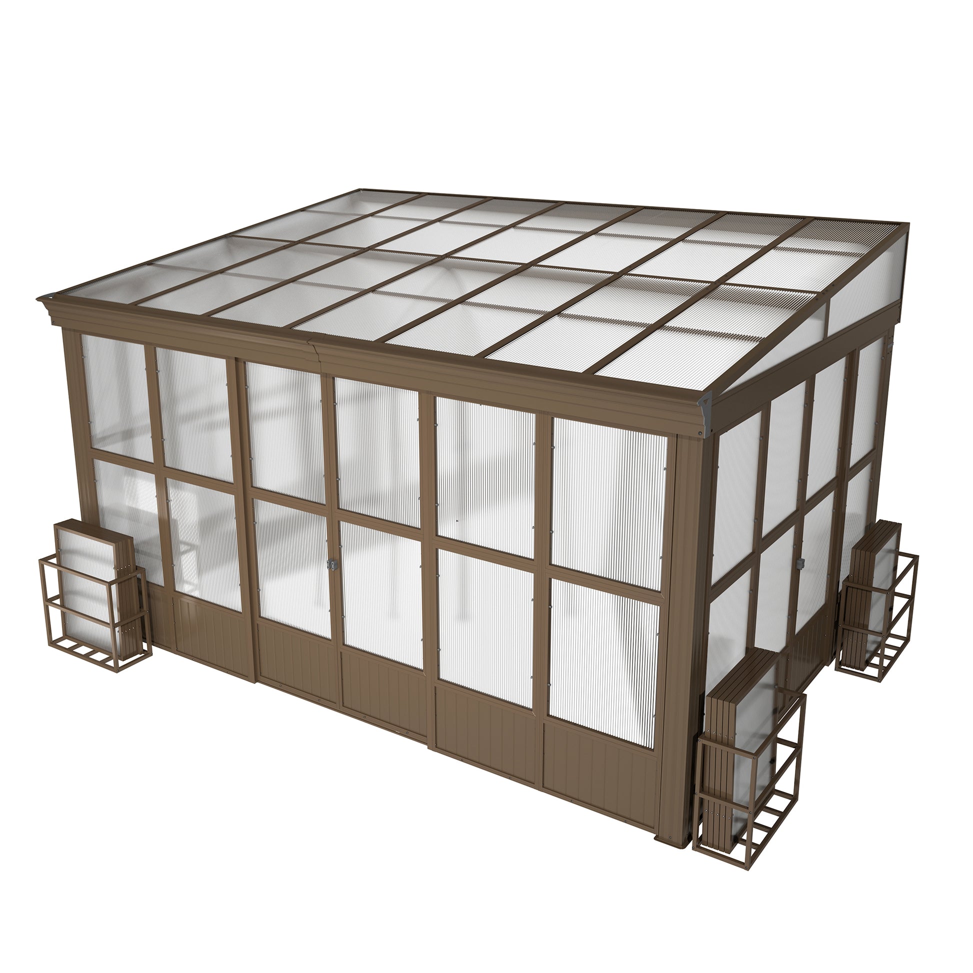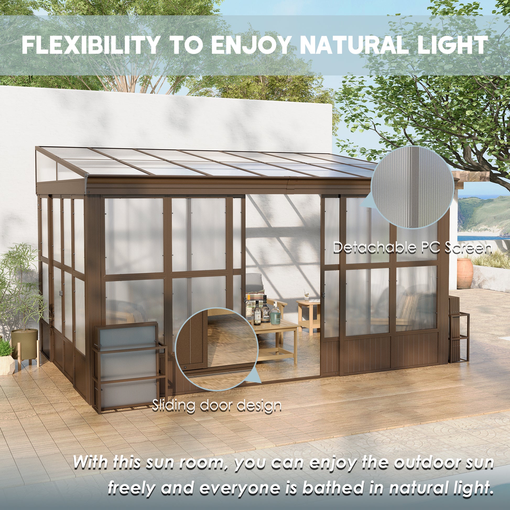 - 🔧🏡Enhanced Design Features-- The redesigned sunroom features polycarbonate panels, offering increased stability and weather resistance compared to traditional vinyl material. This upgrade enhances the longevity of the sunroom.