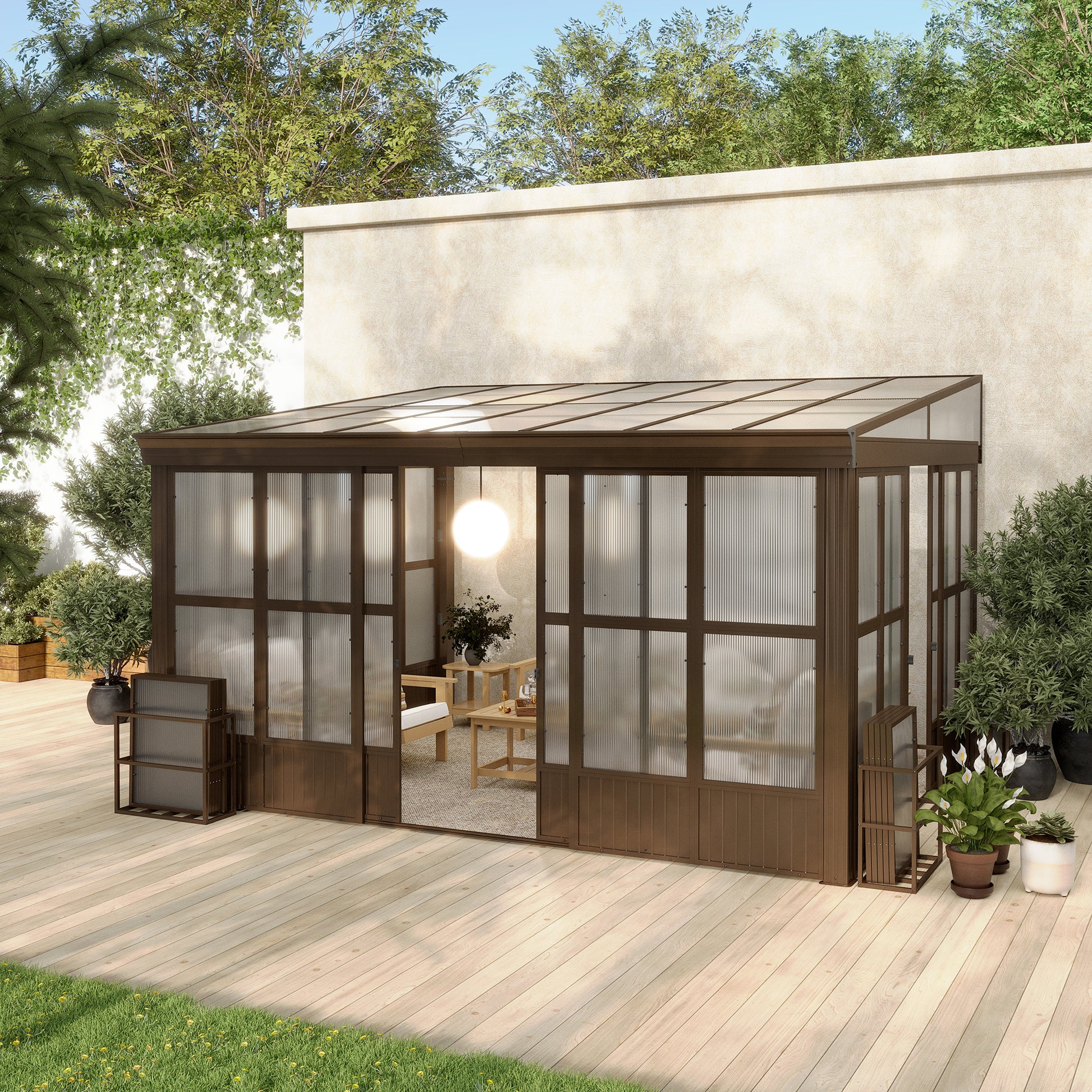 Lean-to Sunroom 12x14FT, Wall Mounted Solarium with Sloping Polycarbonate Roof, Detachable Polycarbonate Screens, 2 Lockable Sliding Doors, Aluminum Gazebo Against Wall Sun Room for Patio Deck