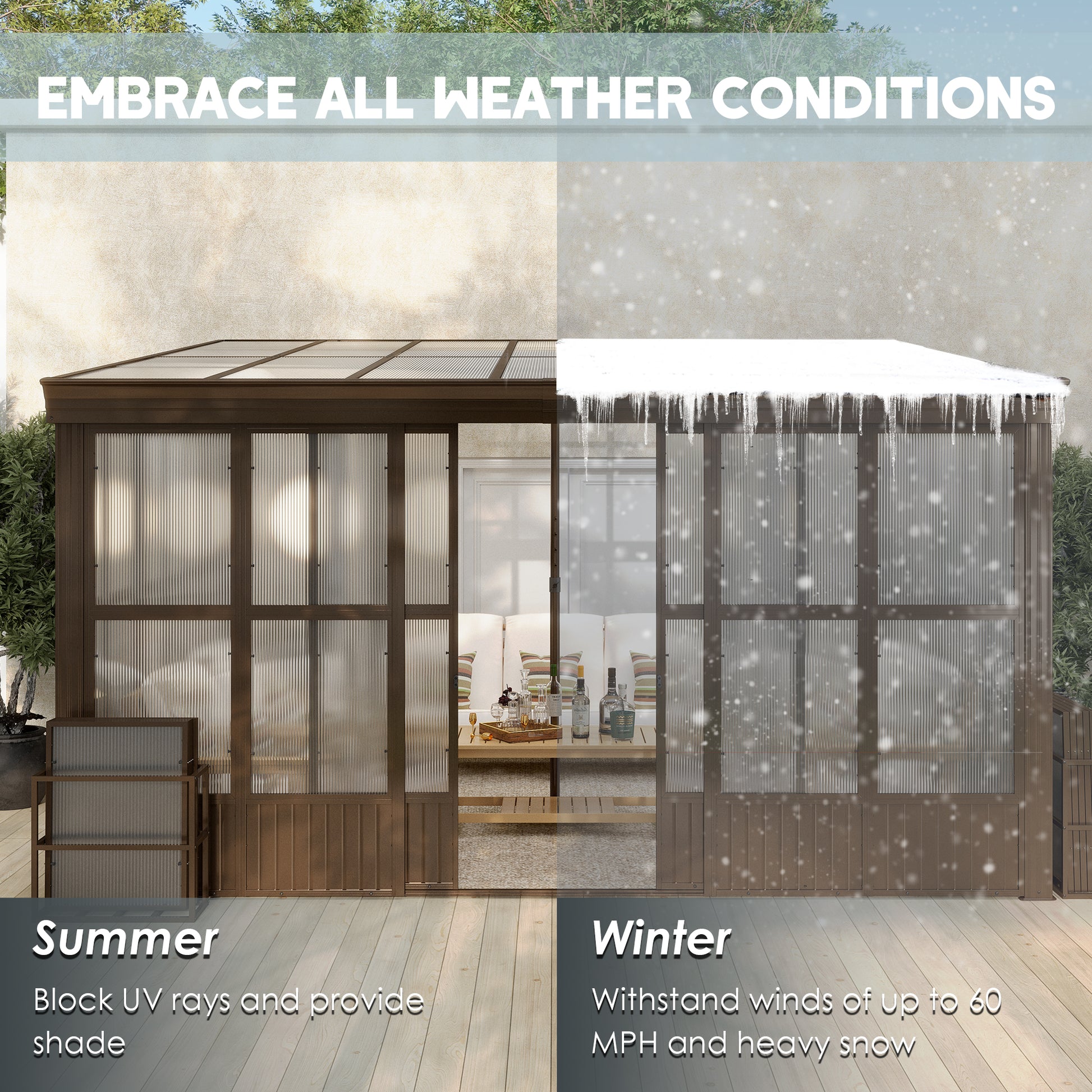 - 💪🏡Sturdy Aluminum Frame- Our solarium is made of premium powder-coated aluminum that can withstand various weather conditions and prevent rust and corrosion, ensuring both aesthetic appeal and long-term outdoor use. Withstand snow pressure of up to 35 pounds per square foot and has a wind resistance rating of 60 miles per hour.