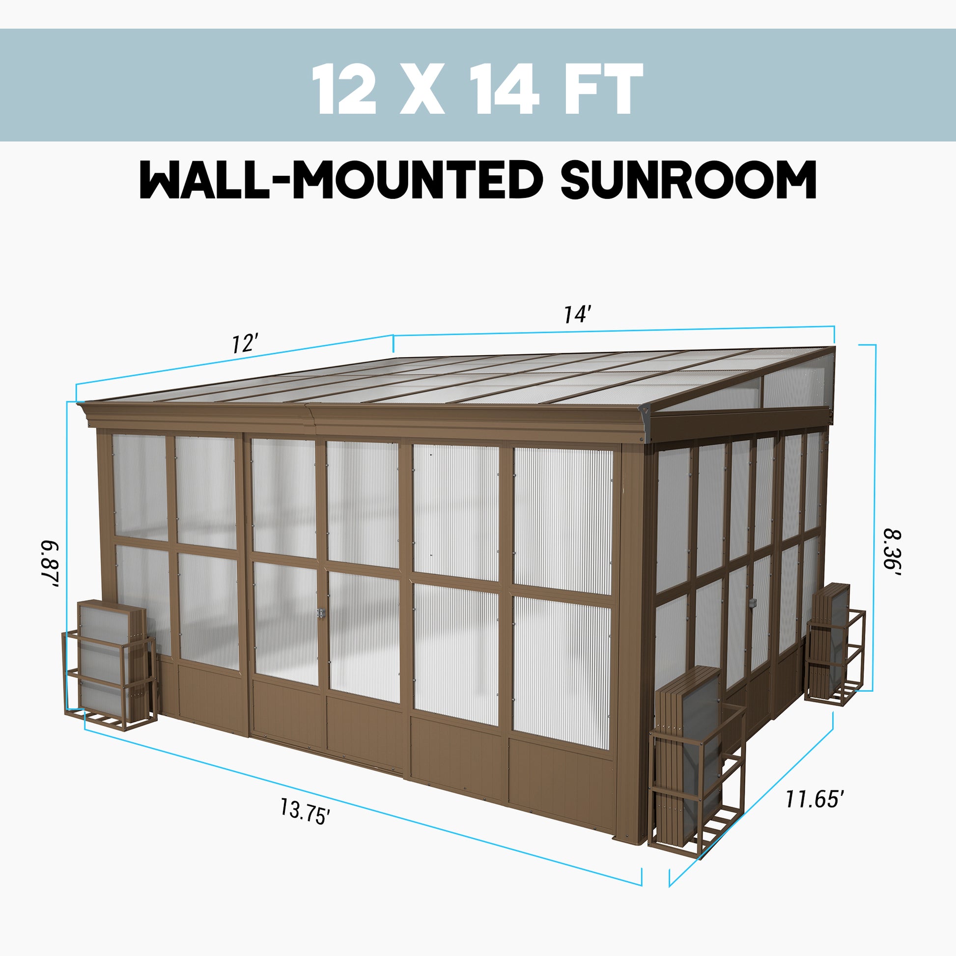 - 🌞🏡Generous Interior Space- Step into your own spacious sanctuary with the wall-mounted sunroom. It offers a spacious area measuring 13.75’L x 11.65’W x 8.36’H, creating an expansive area for you to unwind, entertain, or simply bask in the natural light.