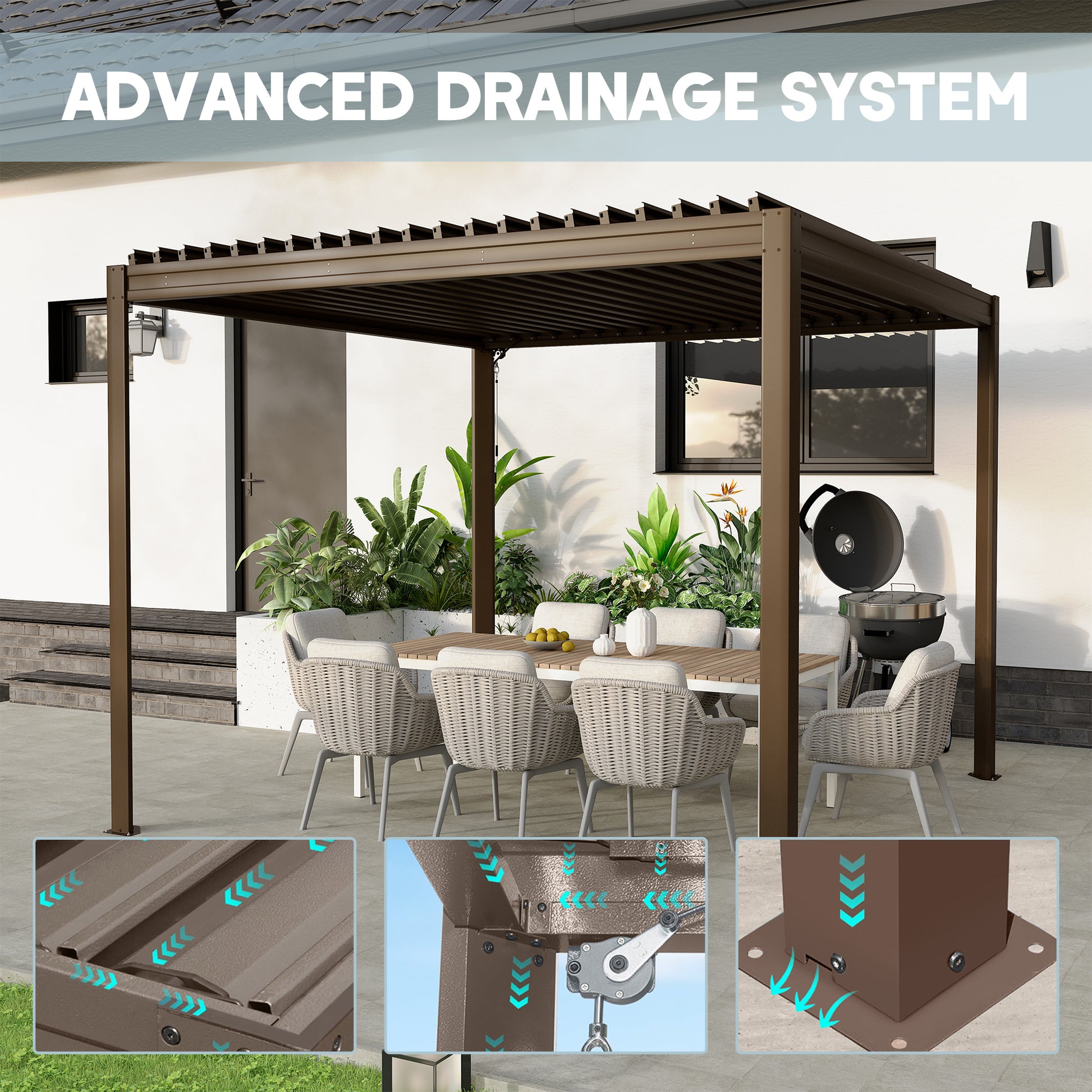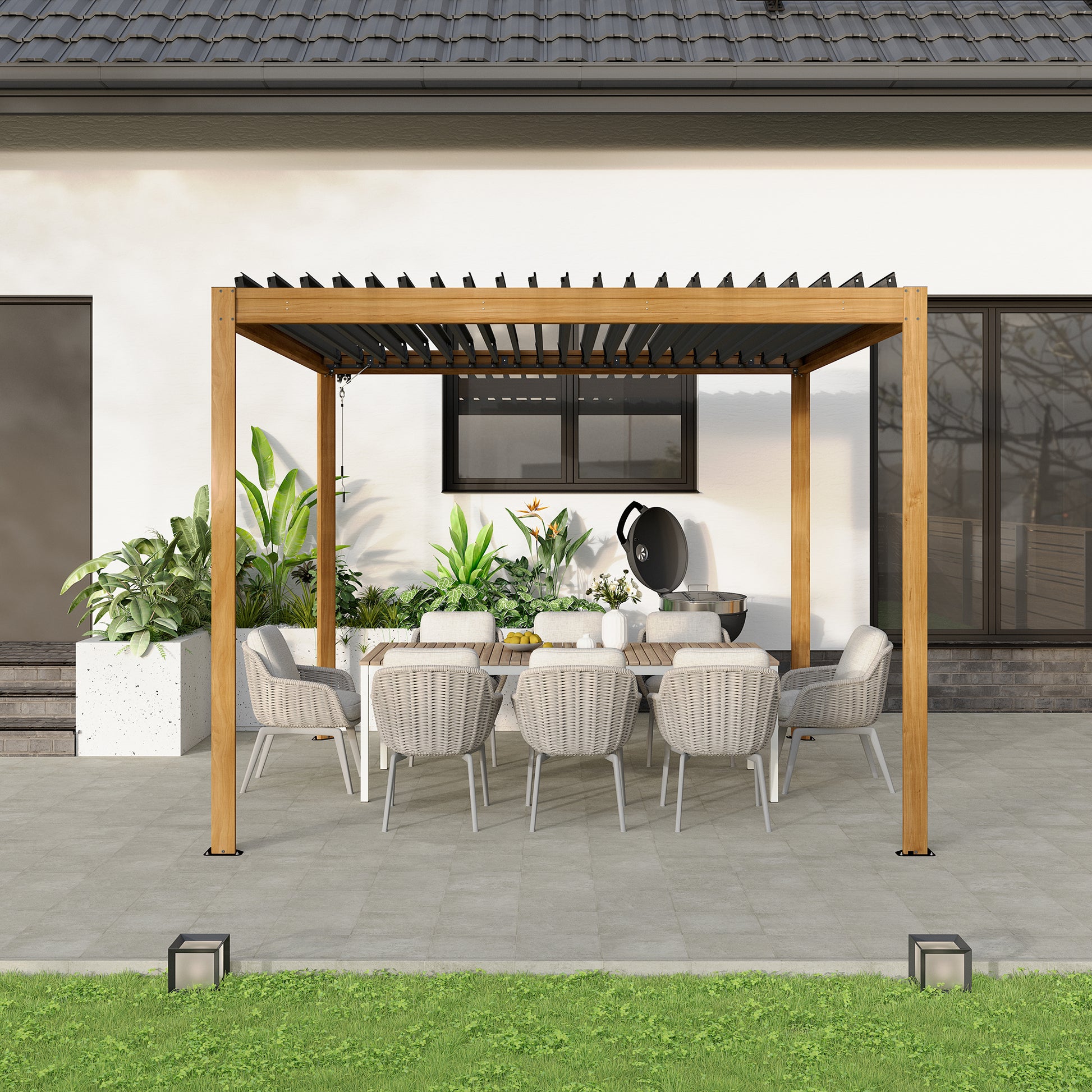 Louvered Pergola 10X10FT, Wood Grain Aluminum Pergola with Adjustable Roof, Wood Looking Aluminum Frame, Efficient Drainage System, Outdoor Pergola for Patio, Deck, Garden