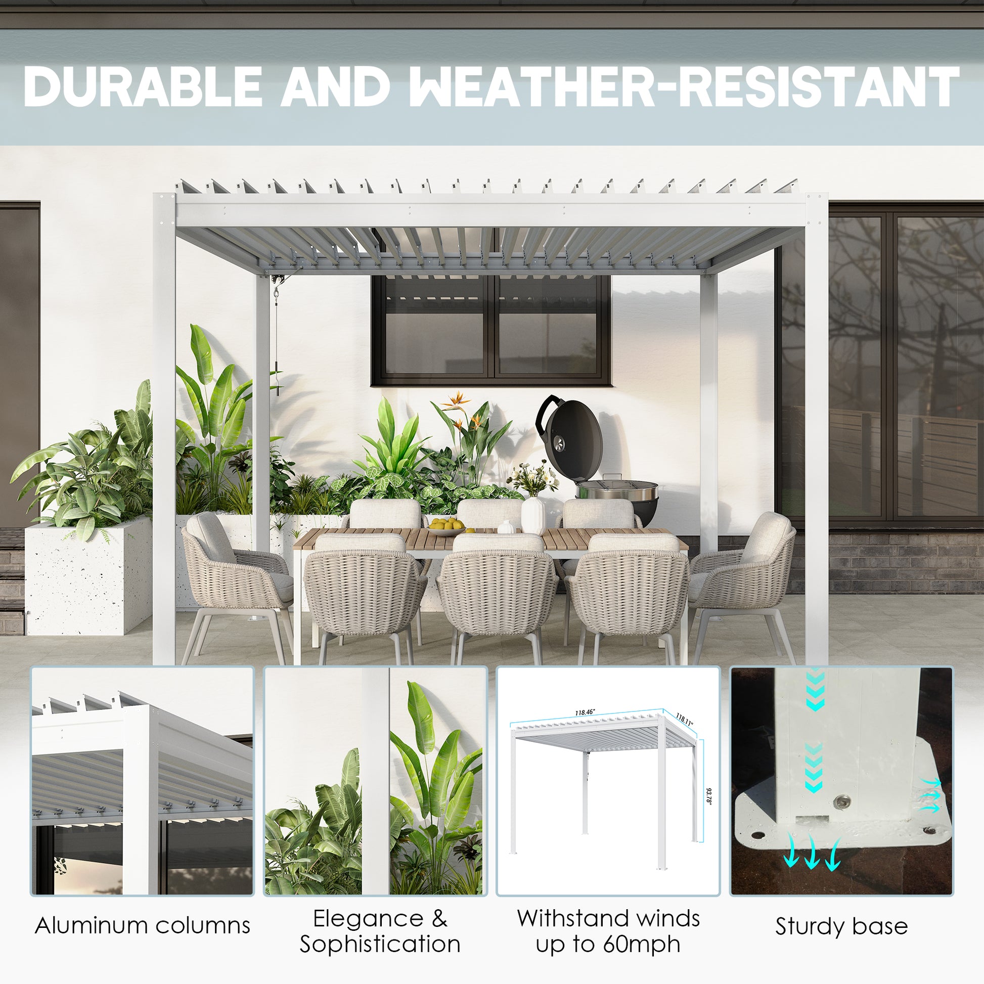 - 💙✨Elevate Your Outdoor Ambiance- white louvered pergola, a blend of sleek design and sophisticated simplicity. Its calm, atmospheric color and clean lines make it a versatile addition to any outdoor space, adding an air of elegance and sophistication. Elevate your outdoor ambiance with this stylish centerpiece!