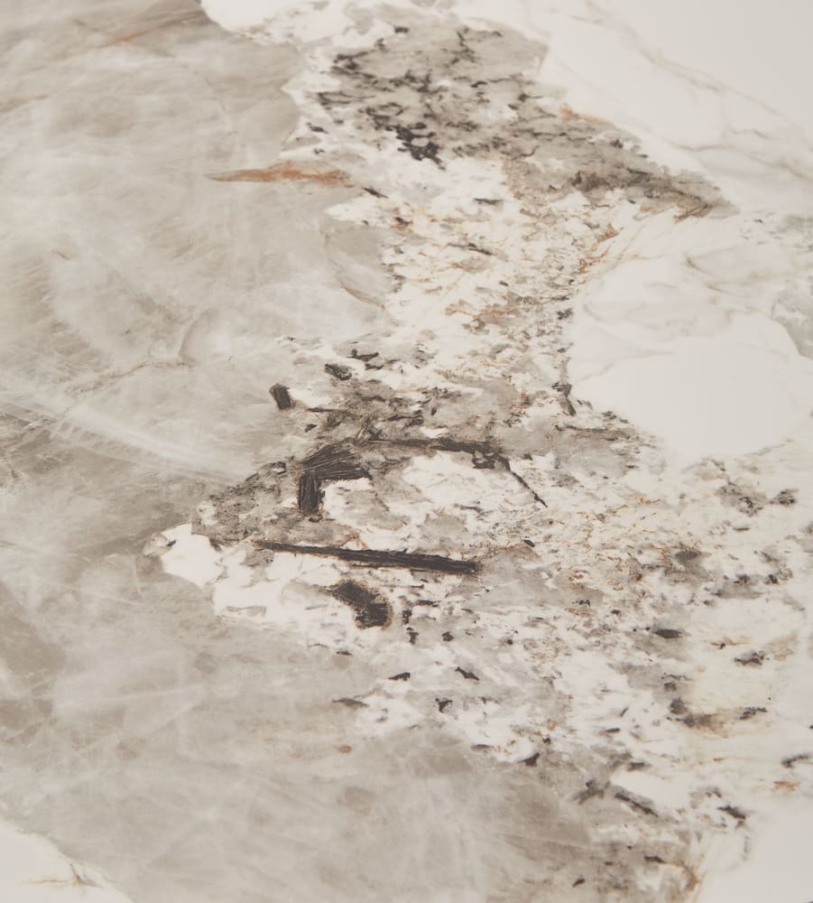 - The round living room table top is constructed from supercrystalline sintered stone, known for its exceptional durability and resistance to scratches, stains, and heat.