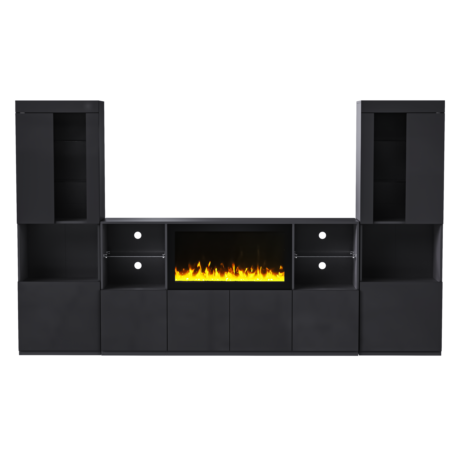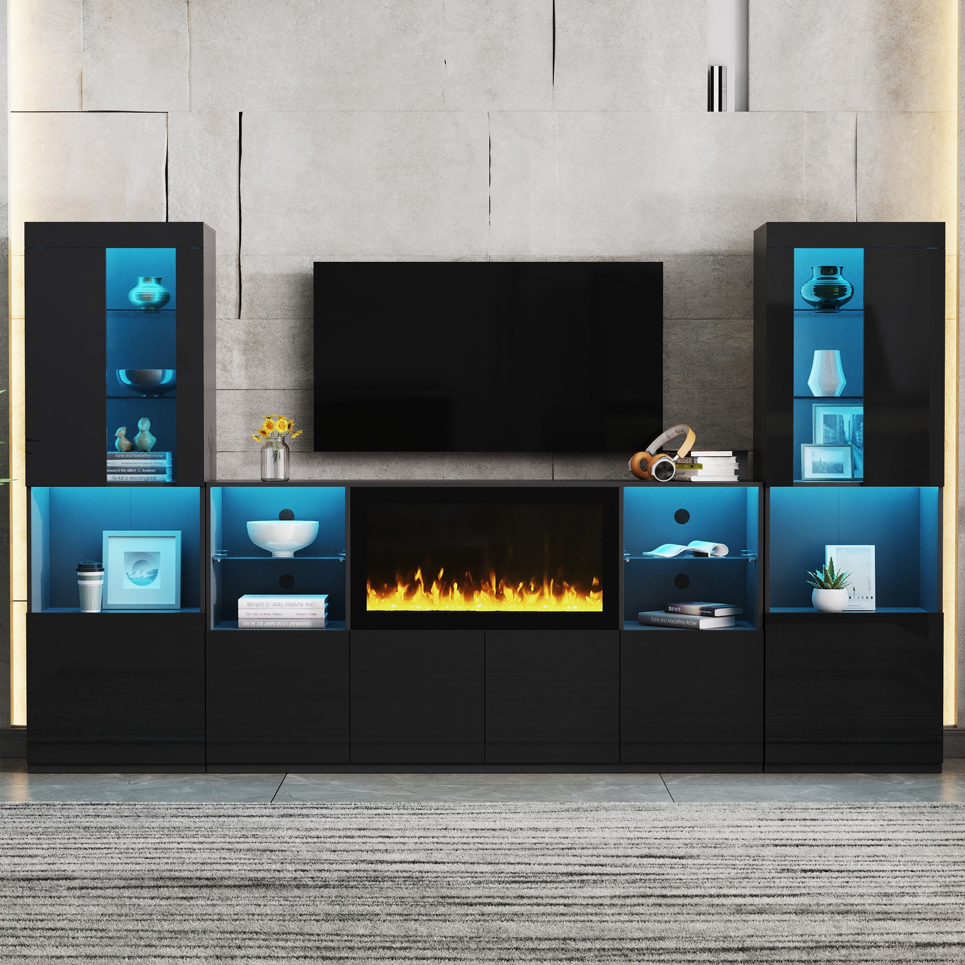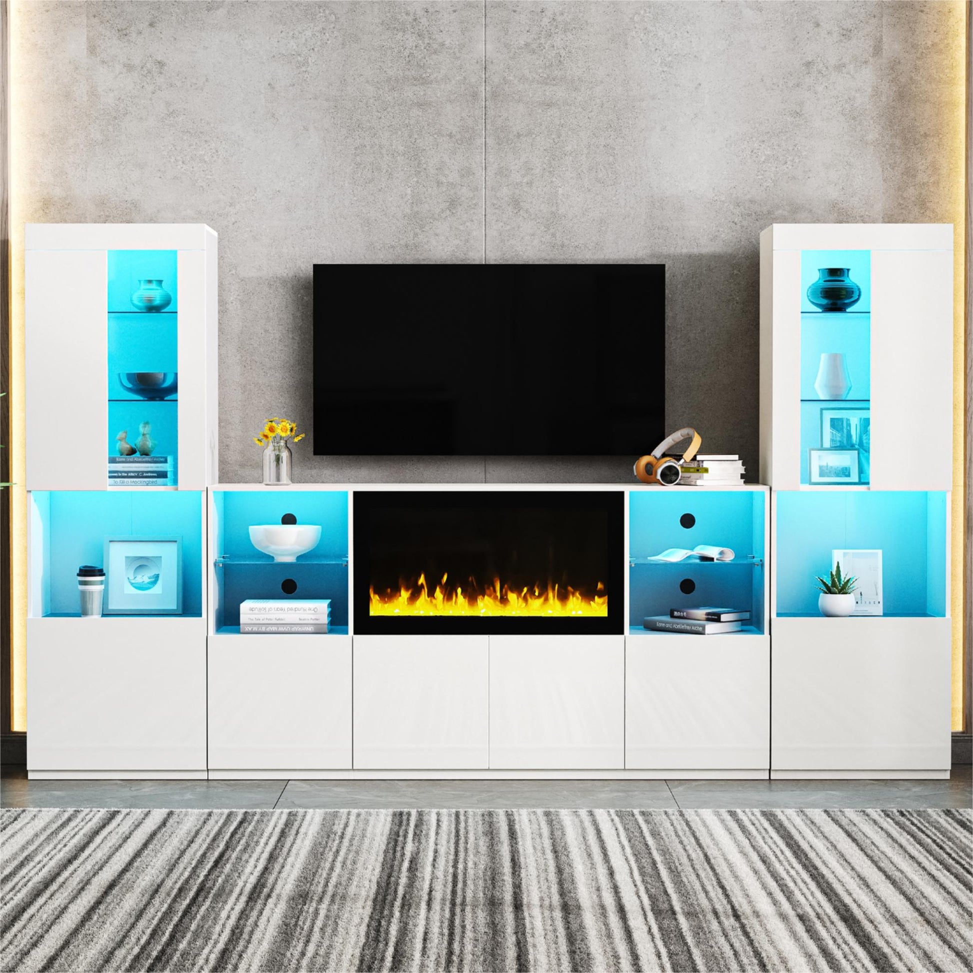 - This media console set, which includes a fireplace TV stand and two tall cabinets, offers ample storage space for your various items. Additionally, it can serve as a display shelf, bookshelf, buffet sideboard, and more, catering to your diverse needs.