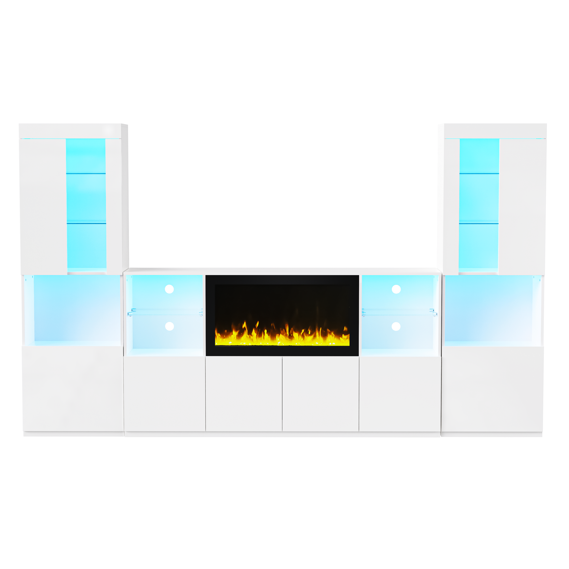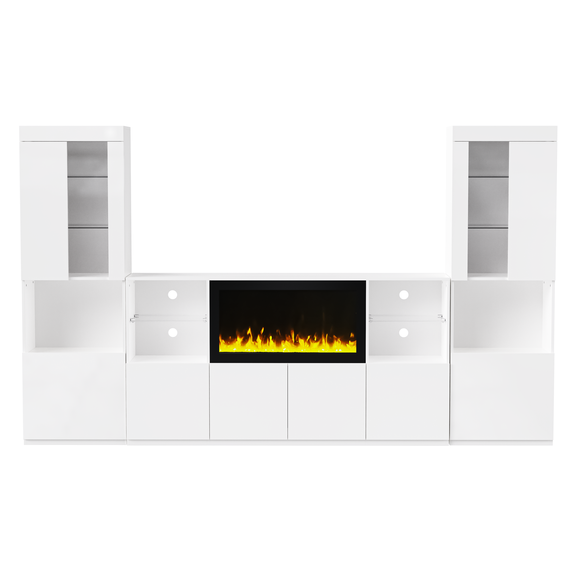 Modern TV Stand with 34.2" Non-heating Electric Fireplace, High Gloss Entertainment Center with LED Lights, Media Console with Tempered Glass Shelves for TVs up to 75", White/Black
