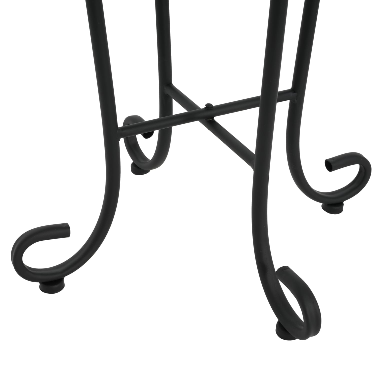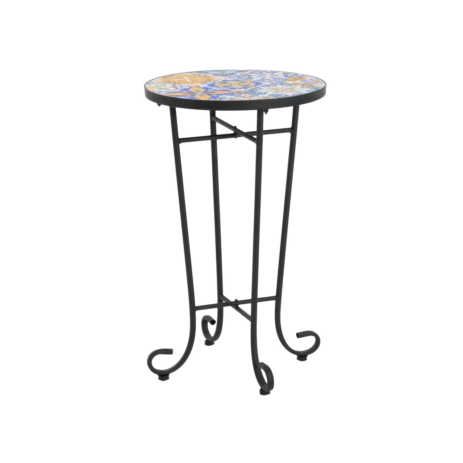 - With its vibrant tile top and scrolling,this outdoor side table brings plenty of French country character to your porch or deck. Its sleek, curved frame is crafted from powder-coated steel with a matte black finish, and it has a weather-resistant design that stands up to UV rays and the occasional rainstorm. The ceramic surface showcases a charming floral design in distressed hues of your choice. We love that the leveling legs keep it from shaking on uneven ground.