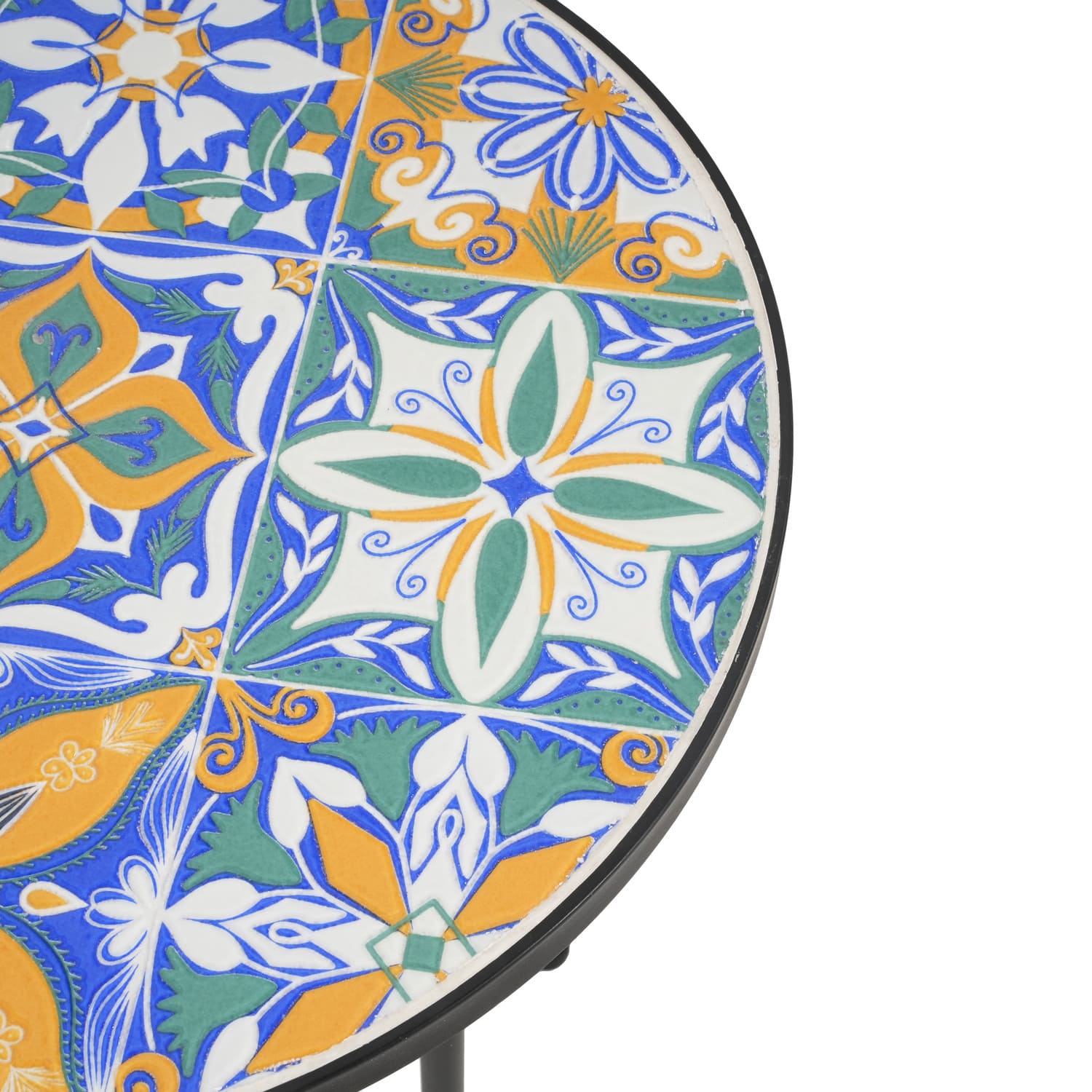 Outdoor Side Table with Colorful Tile Top – French Country Style Patio Accent Table, Powder-Coated Steel Frame with Adjustable Legs