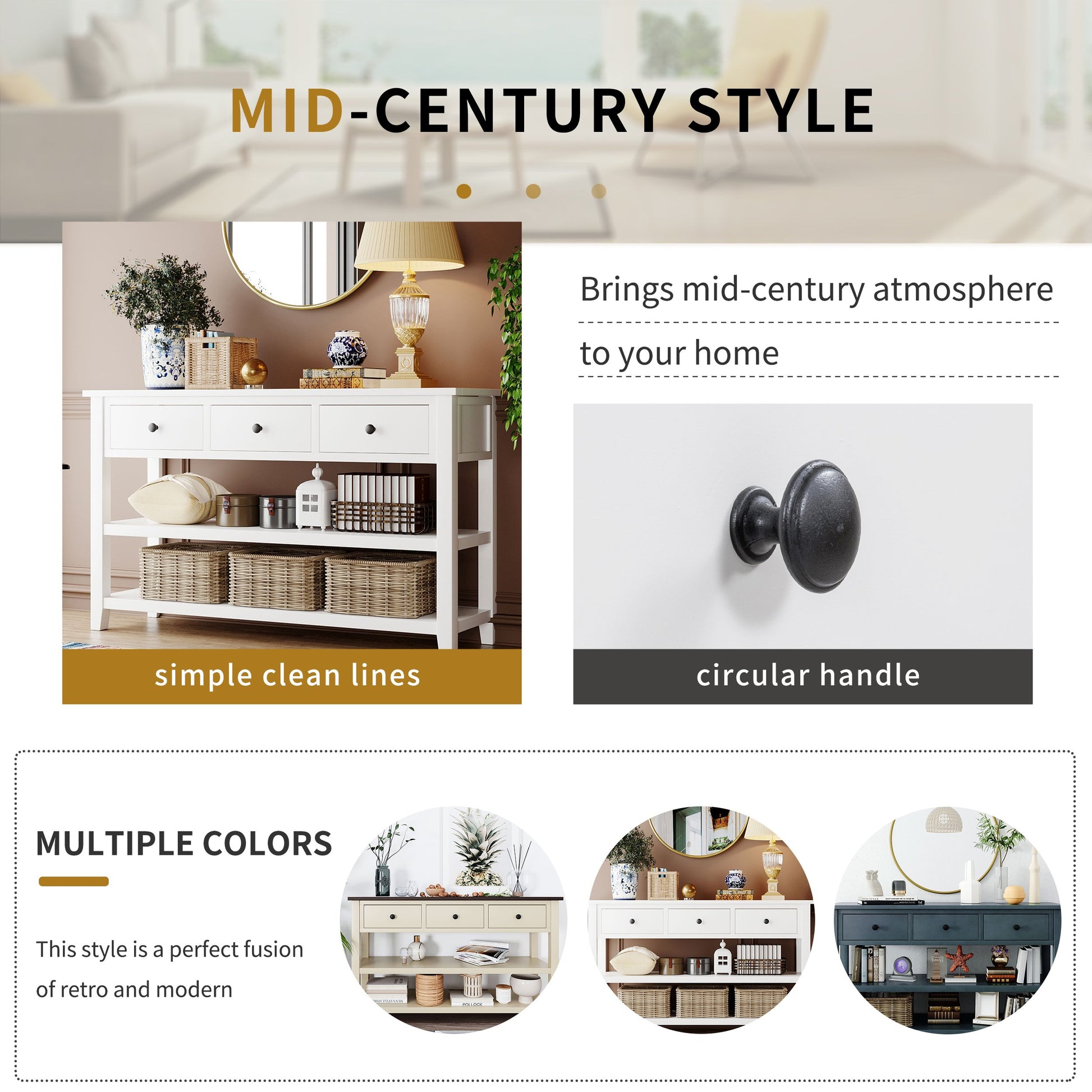 - Mid-century Style: This classic design console table with simple clean lines and circular handle in traditional shape brings mid-century atmosphere to your home. The open design is also fully aligned with the retro aesthetic and practical usage. The neat structure of this console table highlights high-end and dignified. The classic rectangular frame reflects rigorous and understated spirits. And this console table available in multiple colors. This style is a perfect fusion of retro and modern, and it can be a wonderful addition furniture to your house.