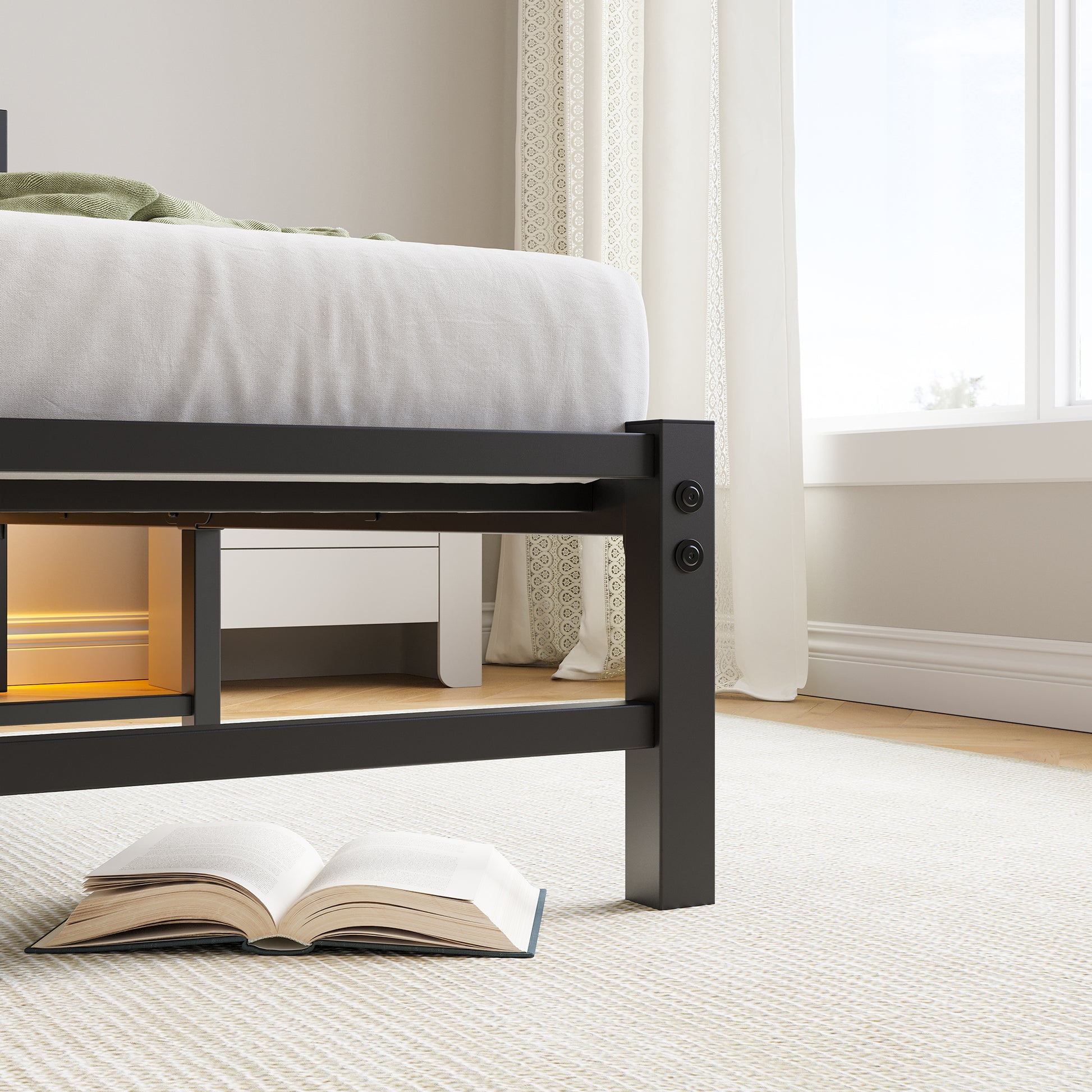 Twin/Full/Queen Size Bed Frame Heavy Duty Platform Bed Frame with Headboard, USB Charging Station, LED Bed, No Box Spring Needed, Mattress Foundation, Strong Steel Slats, Noise Free, Brown/Black