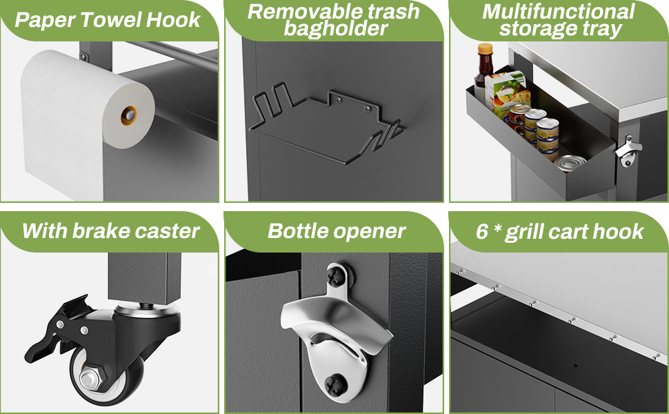 - STORE ALL TOOLS - This grill table can help you keep all your tools together, and the outdoor table is equipped with a paper tower holder, push handle, and a removable trash can.