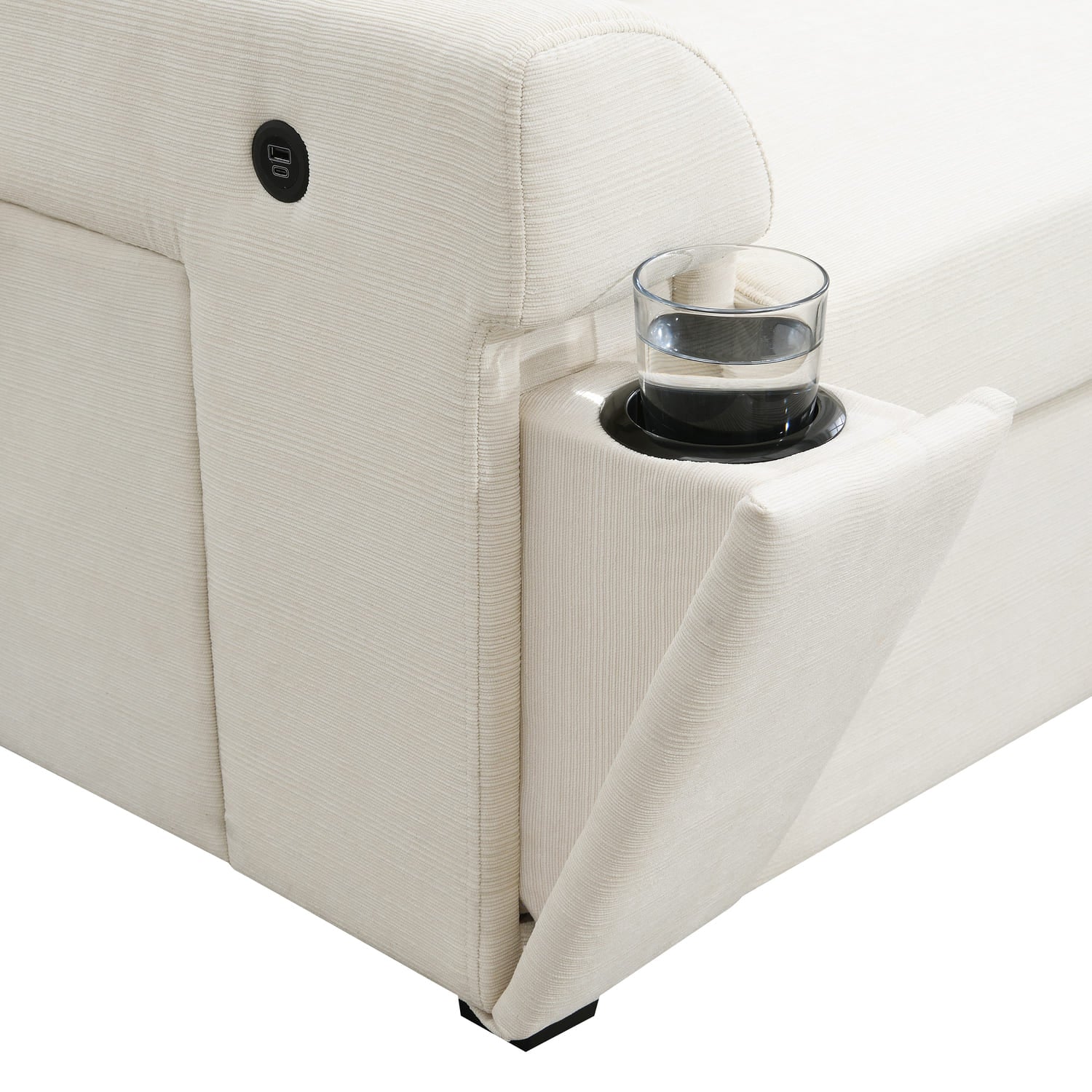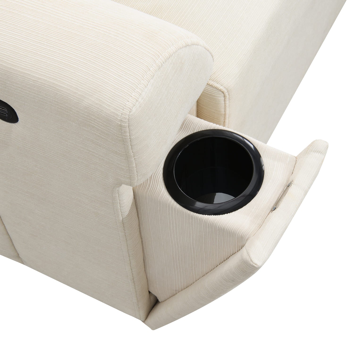- Cup holders and charging ports: The sofa is equipped with integrated cup holders for convenience and charging ports to ensure your devices stay powered while you relax, combining functionality with modern living needs.