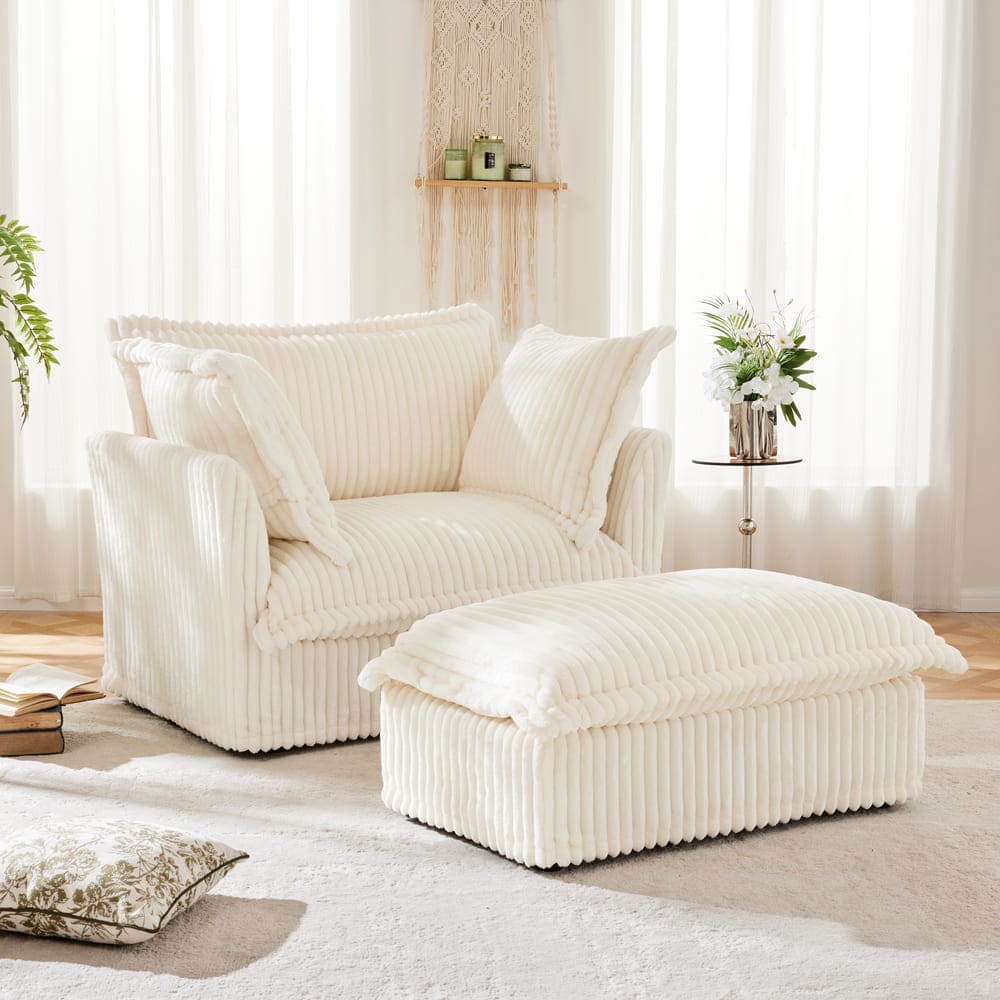 Upholstered Slipcovered Armchair with Ottoman, Deep Seat Armchair W/ Wide Ottoman for Living Room, Armchair Sets with Large Soft Pillows(Set of 2), Cream Corduroy Fabric