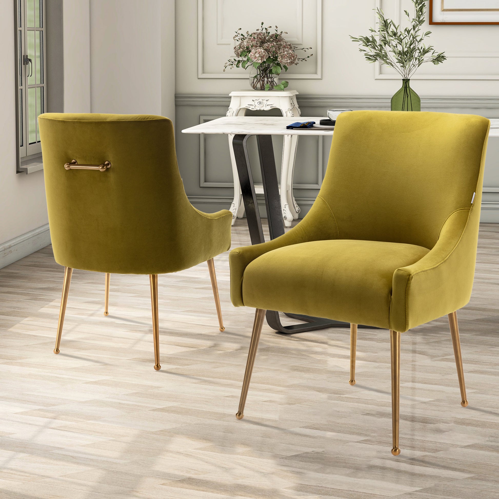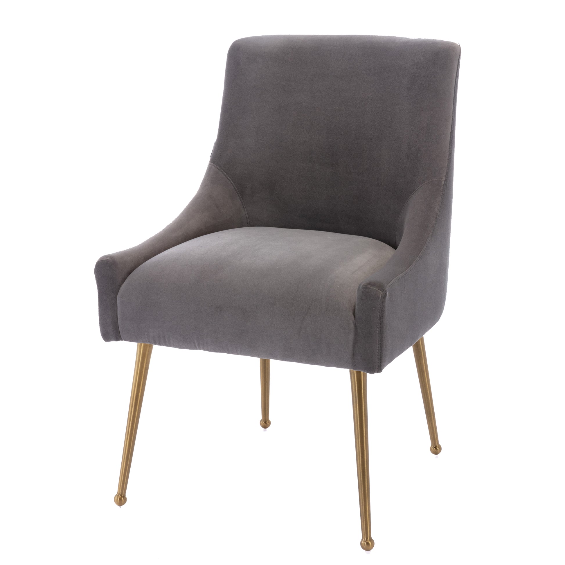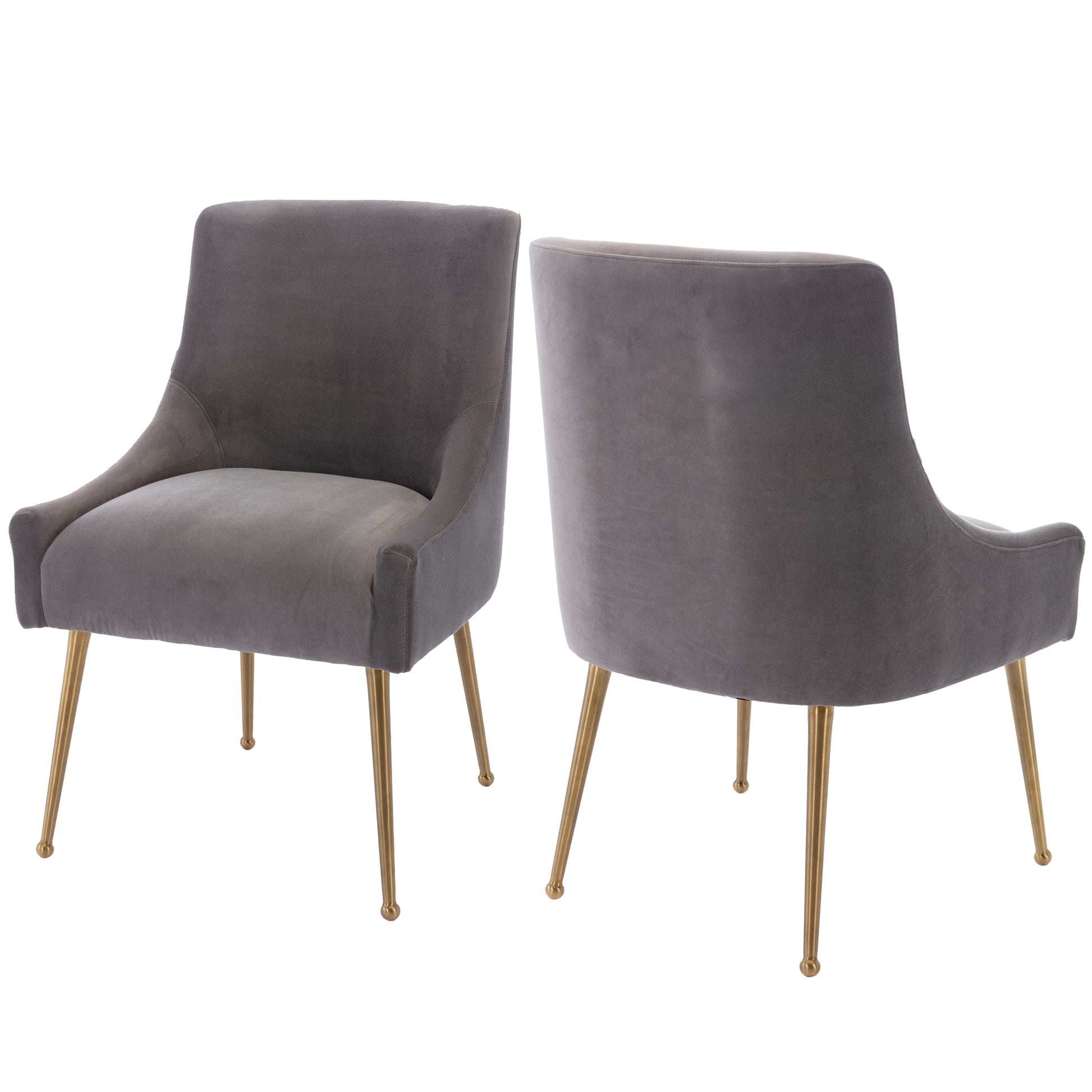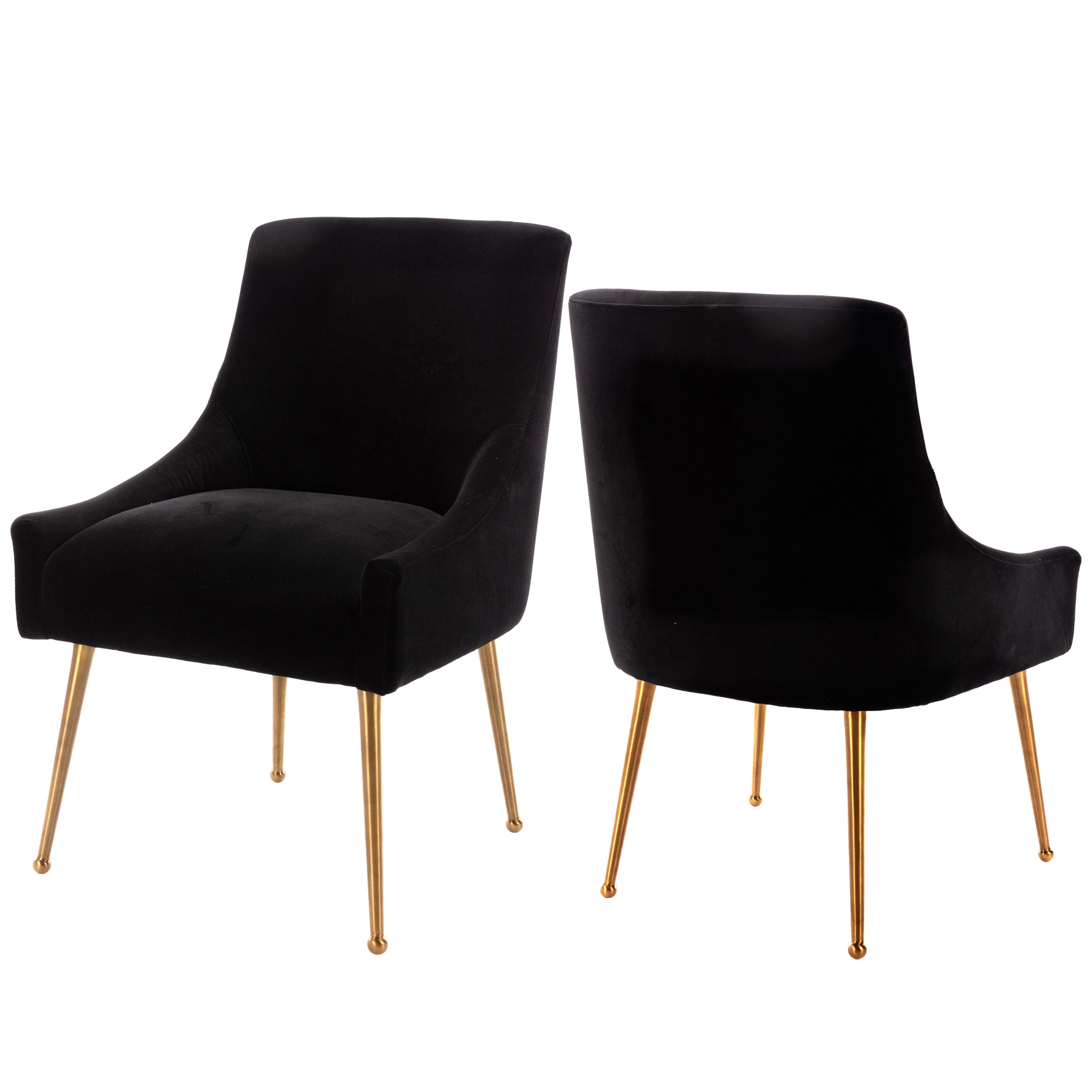 - These chairs beautifully covered with a classic velvet upholstery that adds luster to its comfort. The streamline chair body, the rounded chair leg bottom, the metallic brass legs of the chair and the fashionable color combination, every detail adds the luxurious style to this piece.