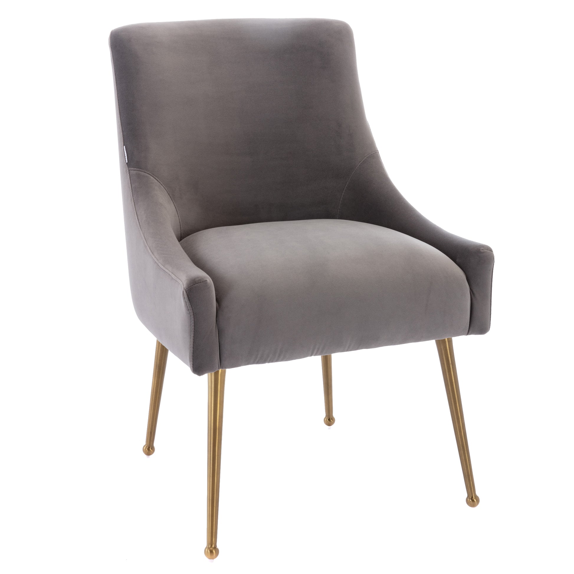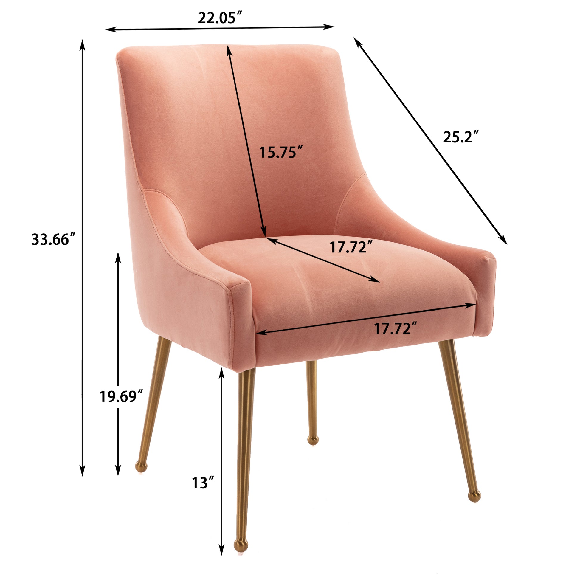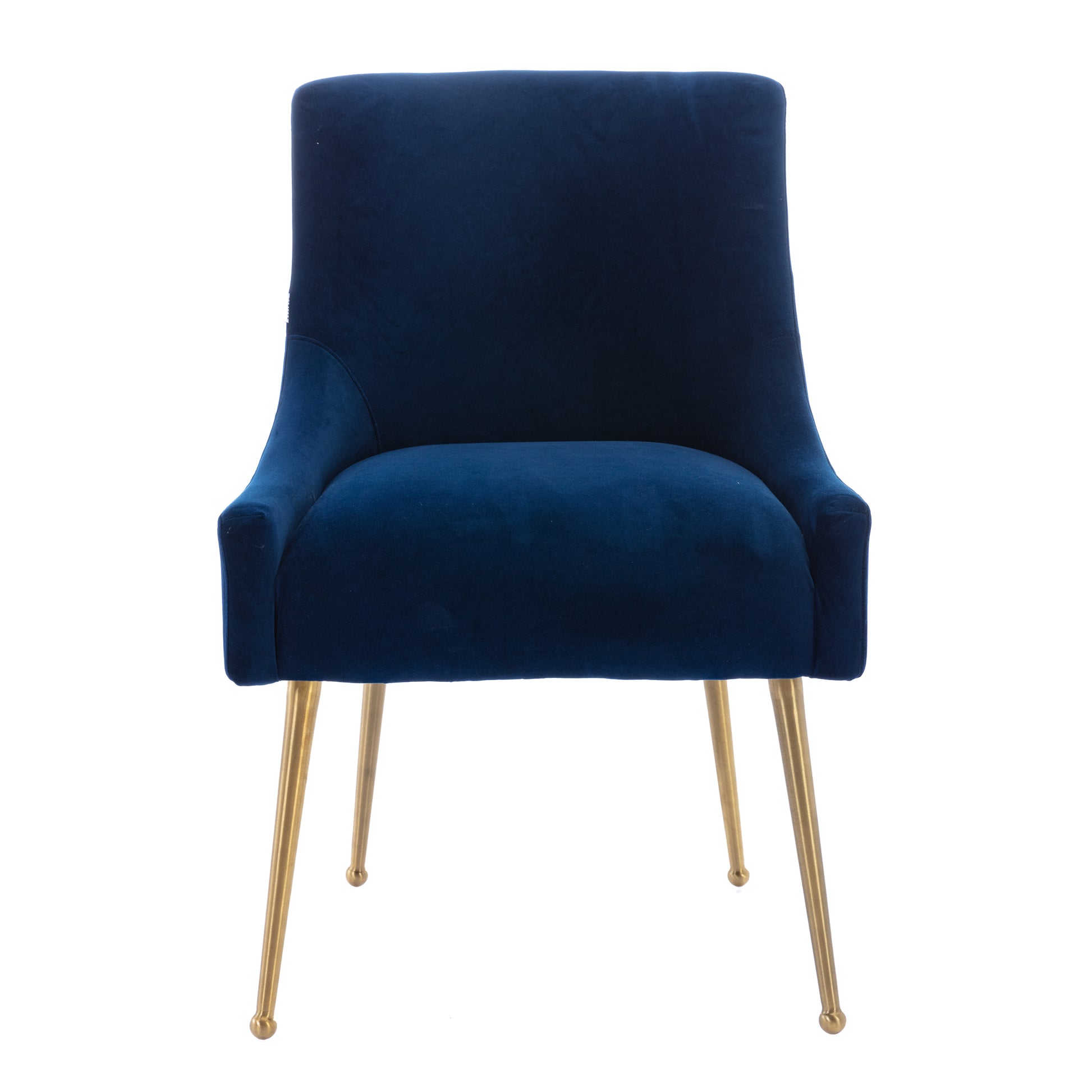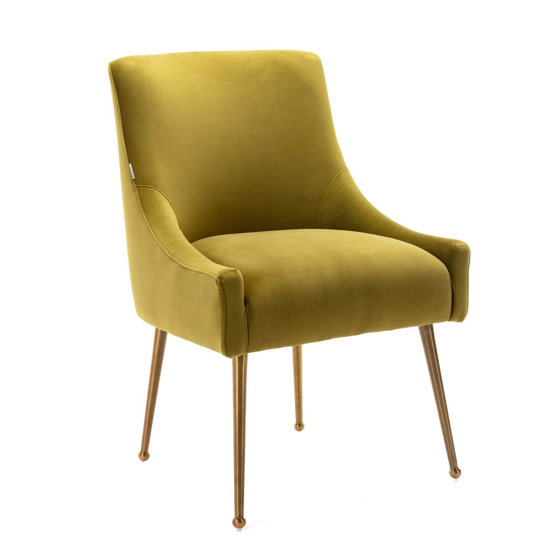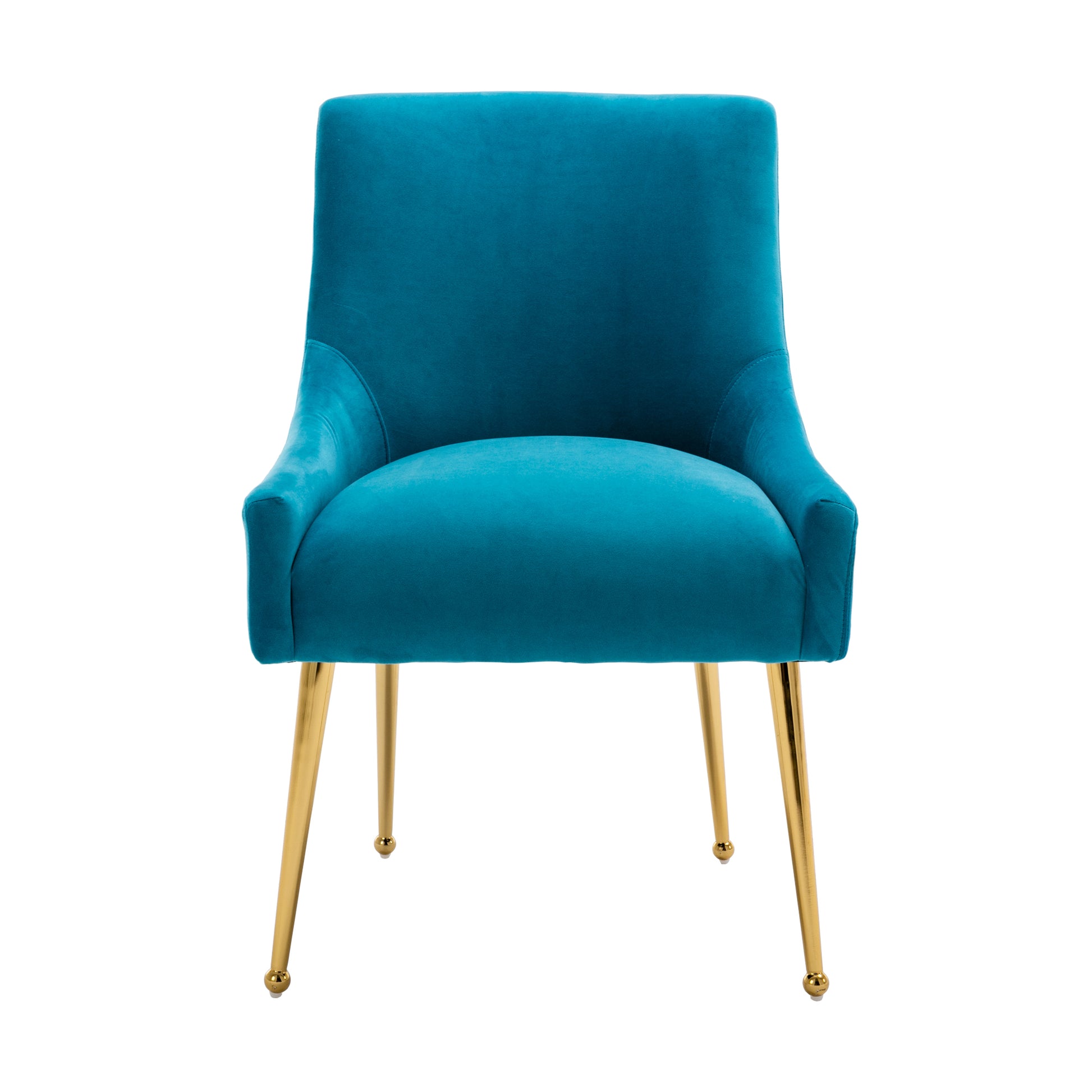 - These chairs beautifully covered with a classic velvet upholstery that adds luster to its comfort. The streamline chair body, the rounded chair leg bottom, the metallic brass legs of the chair and the fashionable color combination, every detail adds the luxurious style to this piece.