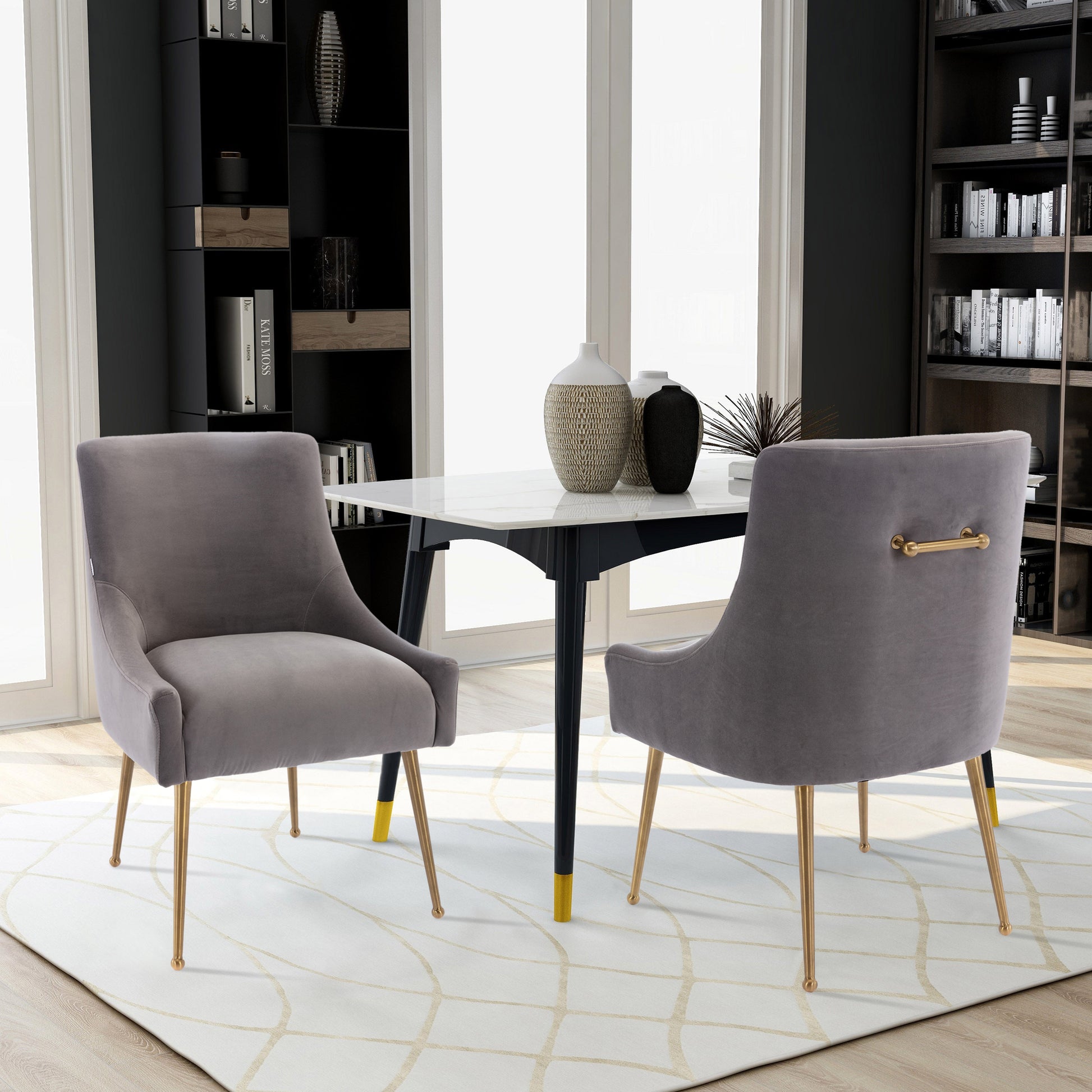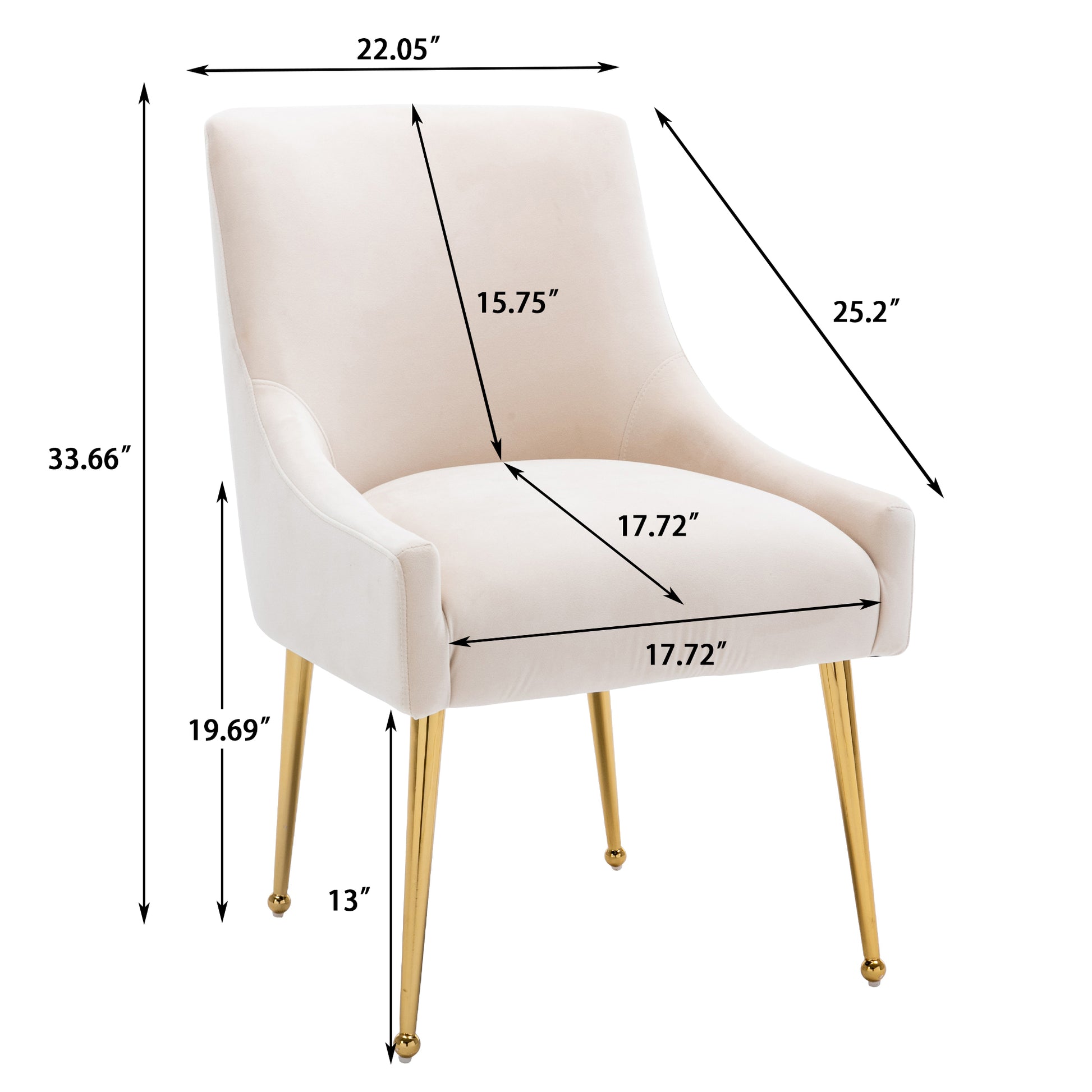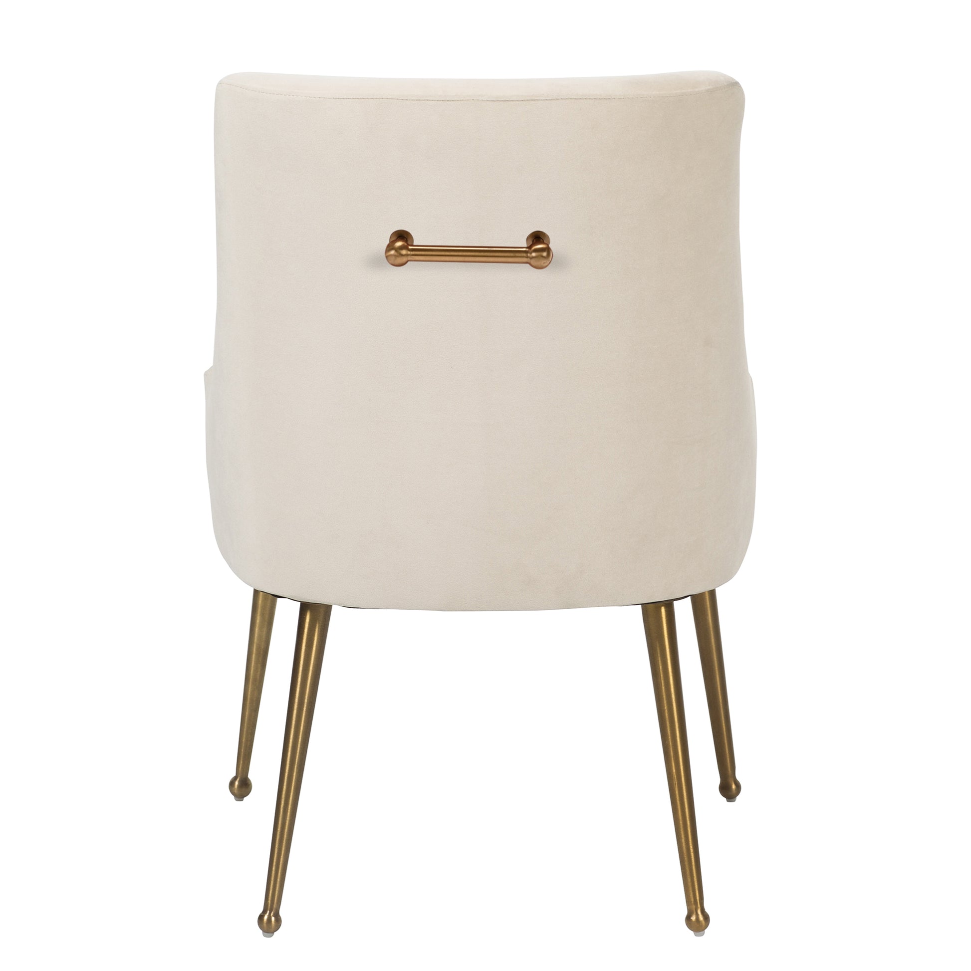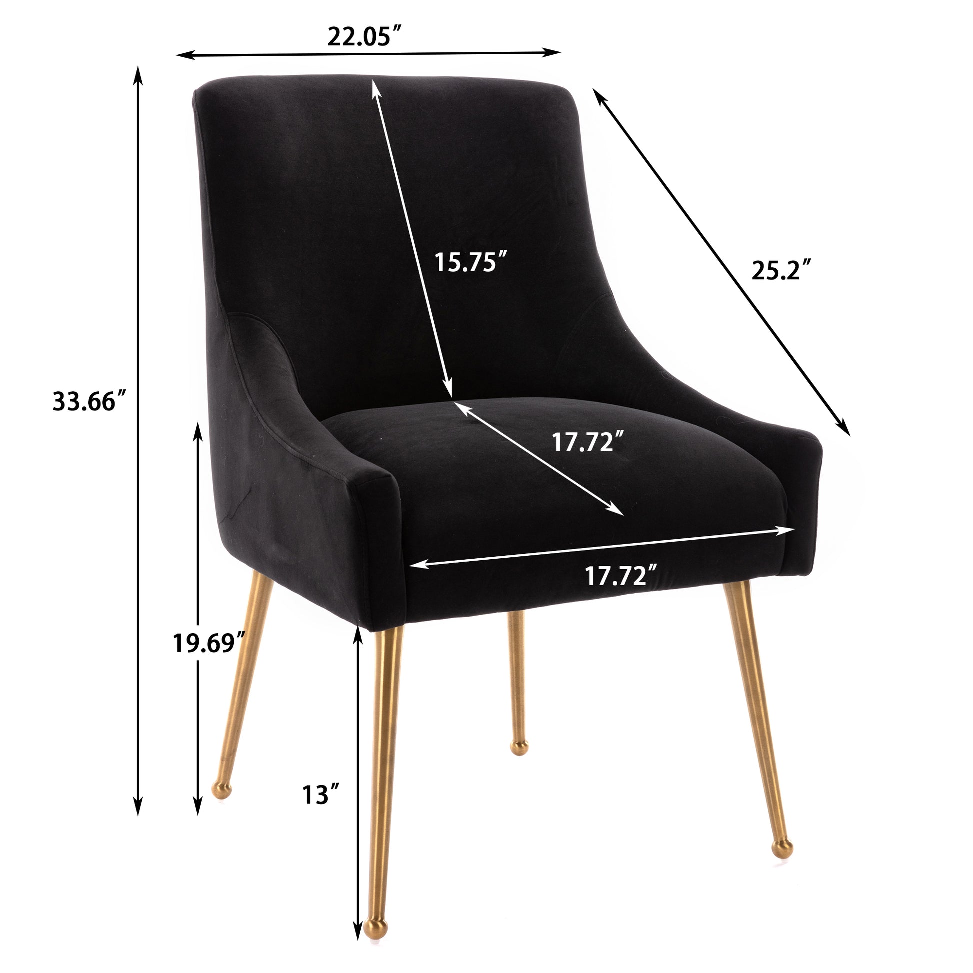 - These chairs beautifully covered with a classic velvet upholstery that adds luster to its comfort. The streamline chair body, the rounded chair leg bottom, the metallic brass legs of the chair and the fashionable color combination, every detail adds the luxurious style to this piece.