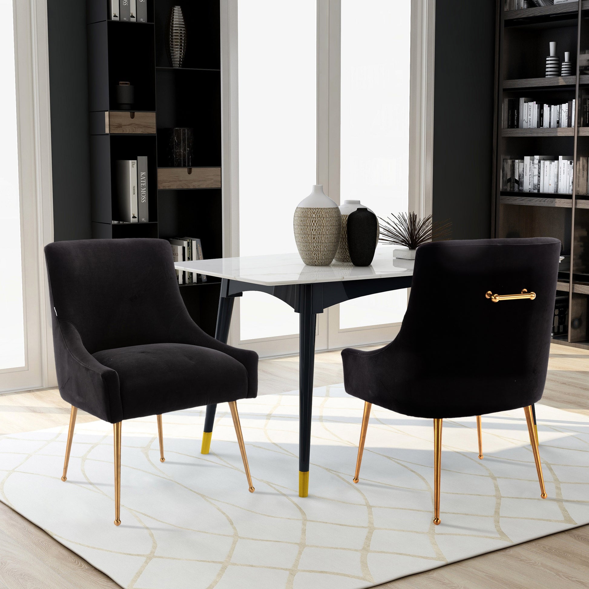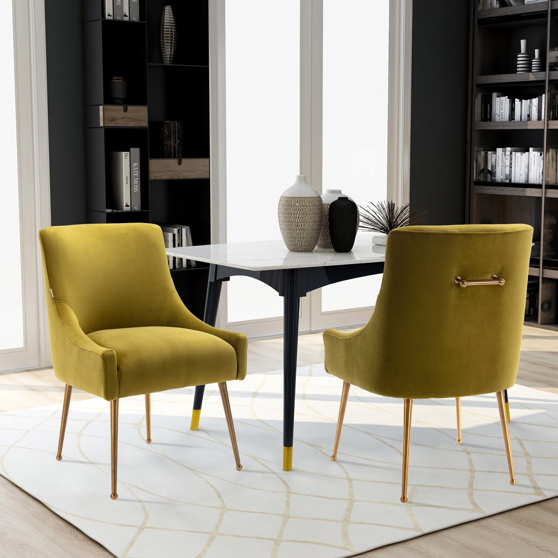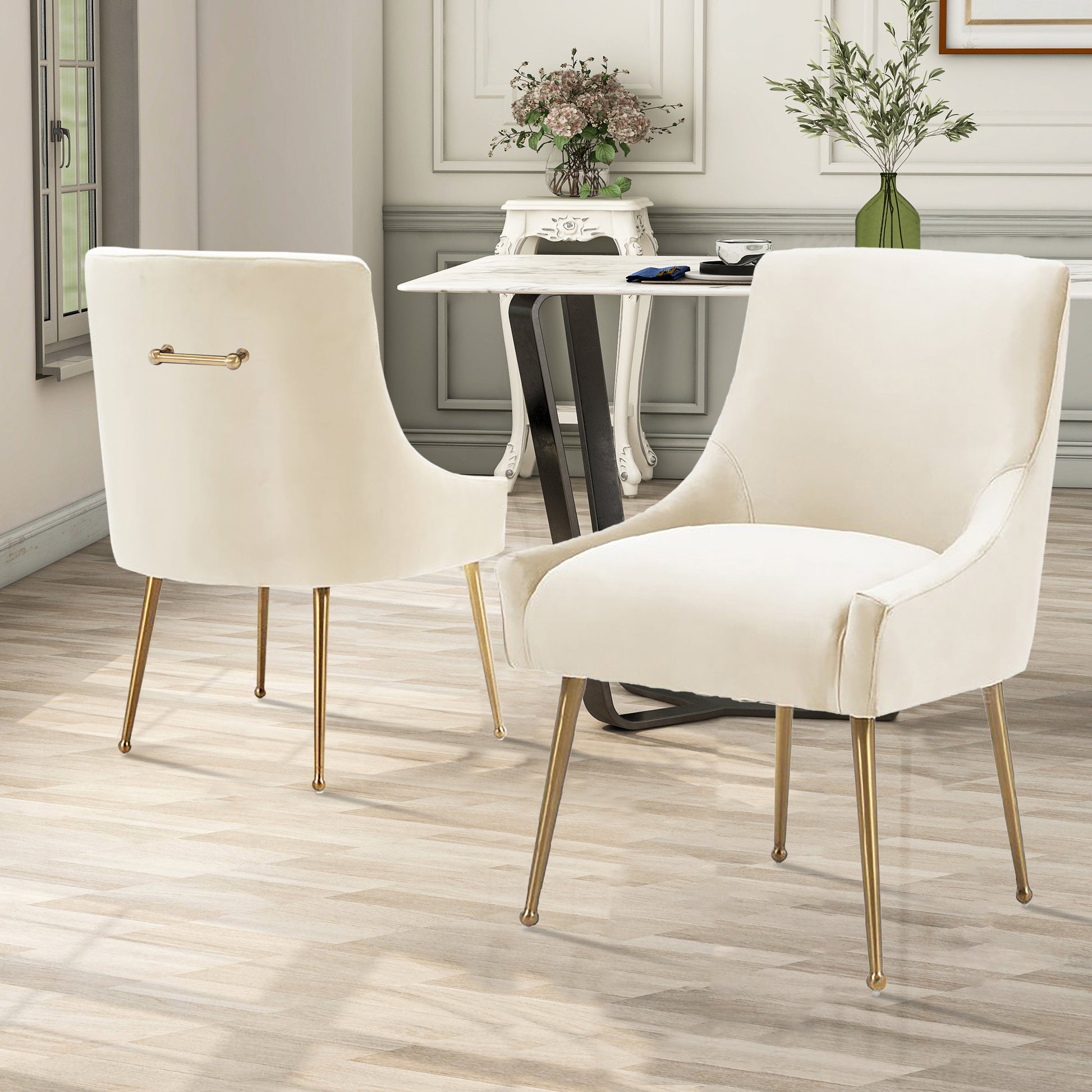This 2-piece dining chair set features velvet interior and chic golden handles, adding a charming modern style to your living room or dining room. Each chair is made of metal. They are built on the top of four flared golden legs with round accents and adjustable foot spikes, suggesting a mid-century modern design. The square backrest and recessed armrests are wrapped in velvet, you can choose the color according to your preference, and they are also filled with foam to provide support during your meal or watching your favorite movie. In addition, this chair is also stain-proof and scratch-resistant, and has high practicability.