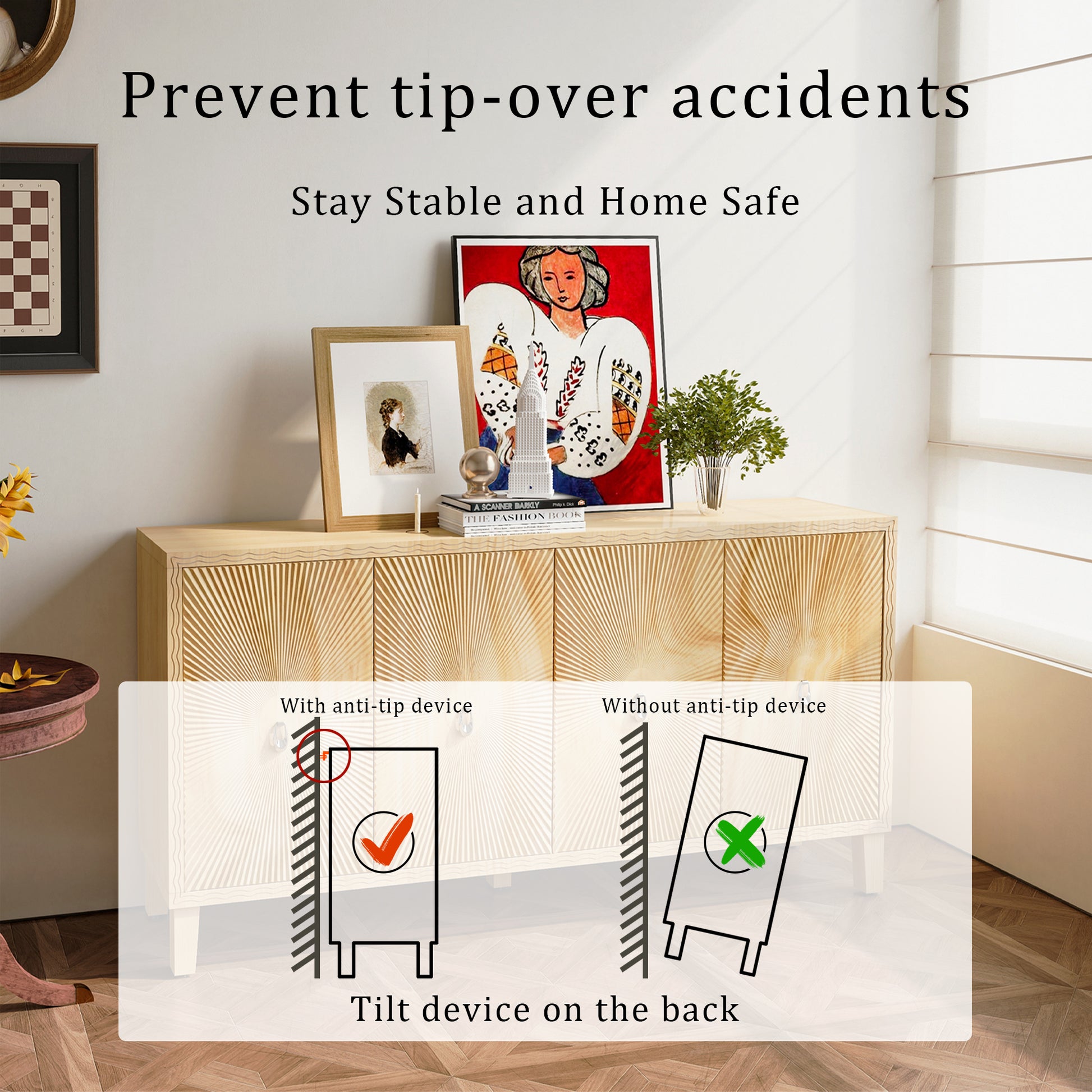Vintage 4 Door Storage Cabinet, Carved Scatter Pattern Dining Sideboard, Large Buffet with Adjustable Shelves, Multifunctional Accent Cabinet Living Room Console Cabinet (Natural)