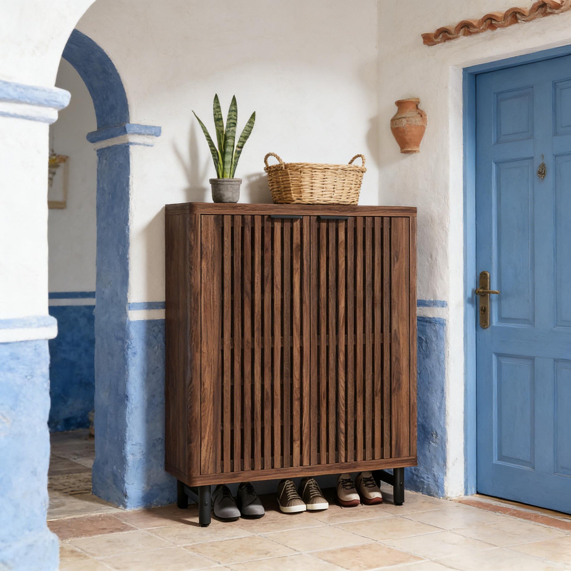 Organize your entryway with this stylish and functional shoe cabinet. Designed with ventilated louver doors in a rich dark walnut finish, it promotes airflow to keep shoes fresh and prevent mildew. The spacious interior offers six adjustable shelves to accommodate everything from sandals to boots, plus an open lower shelf for quick access to daily wear. Crafted from durable MDF with strong metal legs and reliable hinges, it¡¯s built for stability and everyday use. Your safety is prioritized with included hardware, a clear assembly manual, and a rear anti-tip kit for secure wall mounting. Easy to clean and designed to blend seamlessly into your hallway, mudroom, or closet, this cabinet combines practical storage with timeless design.